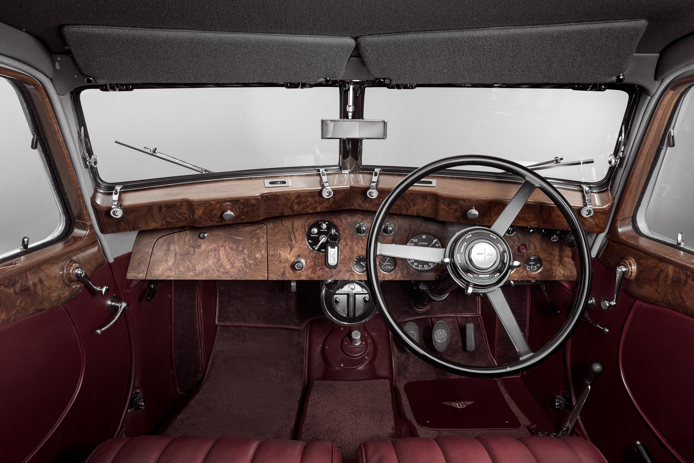 The Mulsanne body-in-white team, where panels are still hand-formed, helped with final detailed finessing of panels; the paint laboratory spent many hours producing colour samples of the main body colour of Imperial Maroon and the side flash of Heather Grey from the limited descriptions available; Head of Interior Design Darren Day and his team produced CAD designs for the seats and door trims derived from detailed historical research; and the Mulliner trim team worked from the designs to create a period-appropriate interior in typical Vanvooren style, using the correct Connolly Vaumol hide, West of England cloth and the carpet from a roll discovered stored away on site.