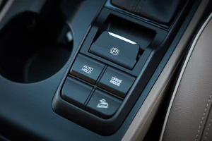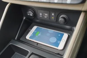 Below is a wireless Qi phone charger, gear lever, cup holders and drive option buttons. Auto Hold, Parking sensors, Hill Descent, and Drive Mode are neatly laid out behind the Parking Brake button.