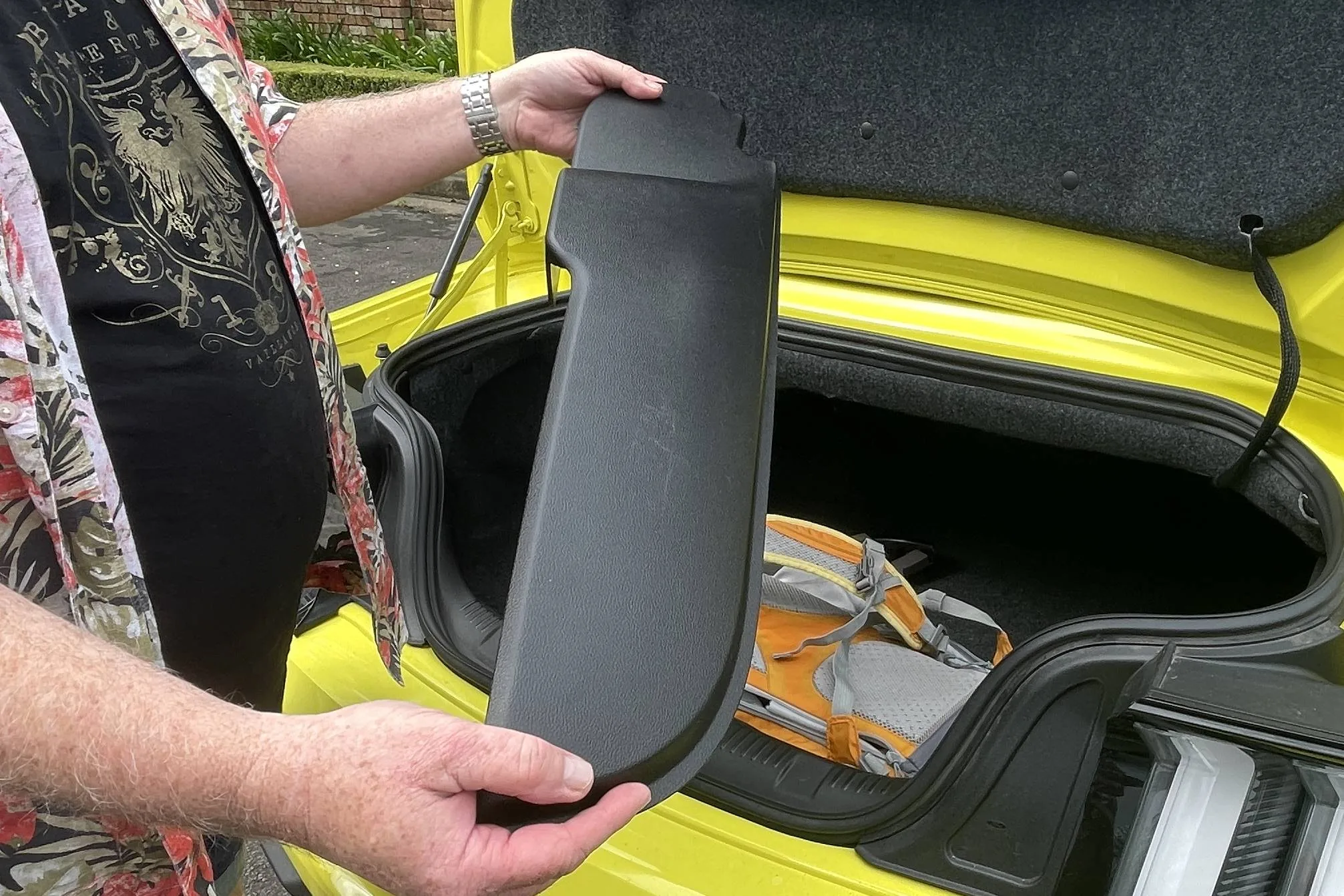 Without a proper cover, the folded roof mechanism can be seen within the rear panel. There are a couple of awful plakky moldings in the boot that can be placed over these openings, but it is, without a doubt, the worst executed example of cost cutting I’ve ever seen.