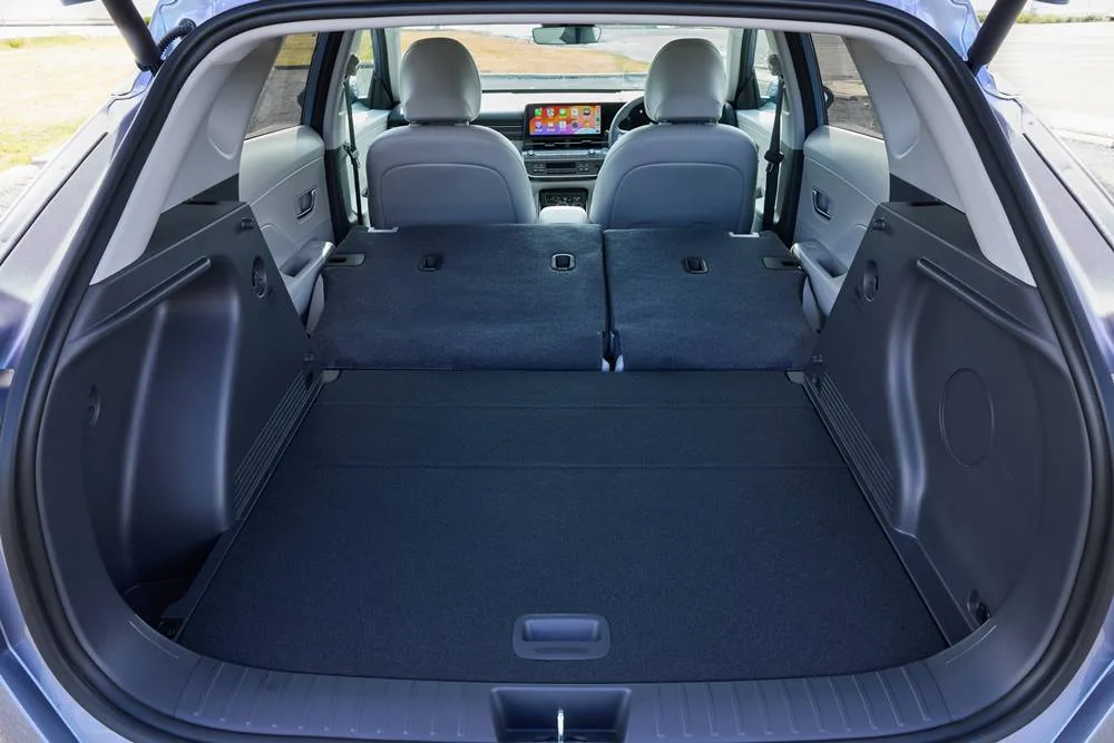 Kona Electric has the Hyundai Group’s party trick, a domestic power outlet for a bit of VTL handiness. There are also a couple of fast-charge USB-C outlets, and a centre vent for gentle wafts of conditioned air are the rear of the front console.