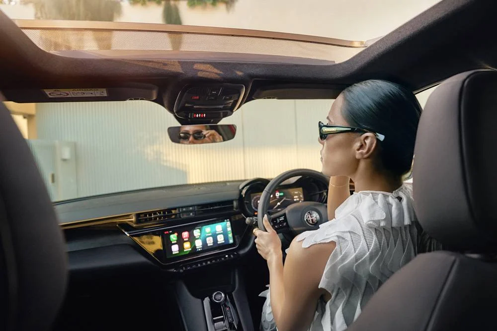 Inside, it’s an Italian-inspired cocoon of curves, screens, and stitchwork. The 10.25” cannocchiale digital cluster sits behind the wheel like a pair of chic opera glasses, flanked by another 10.25” infotainment screen angled toward the driver.