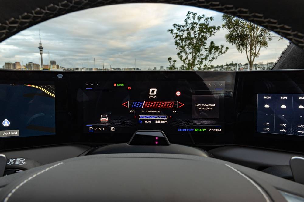 Storage? Look, it’s a convertible, not a moving van. You get 249L in the boot (no frunk), cubbies in the doors, and a handbag-sized nook behind the seats for snacks, secrets, or regret. Door releases? Oh darling, they’re everywhere — fob, console, edges. It’s a game of hide and seek just to get in and out.