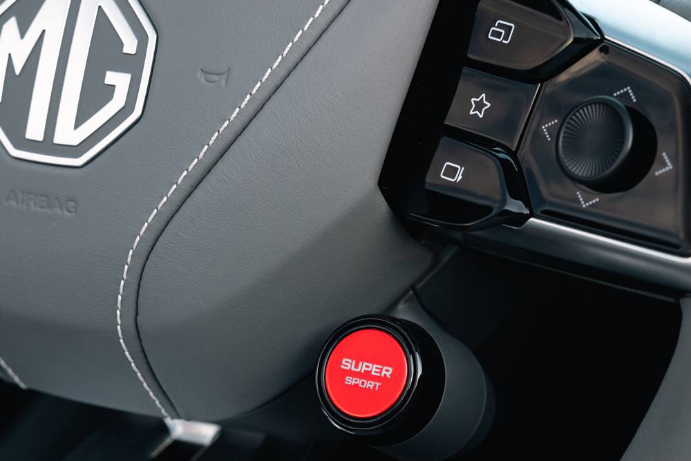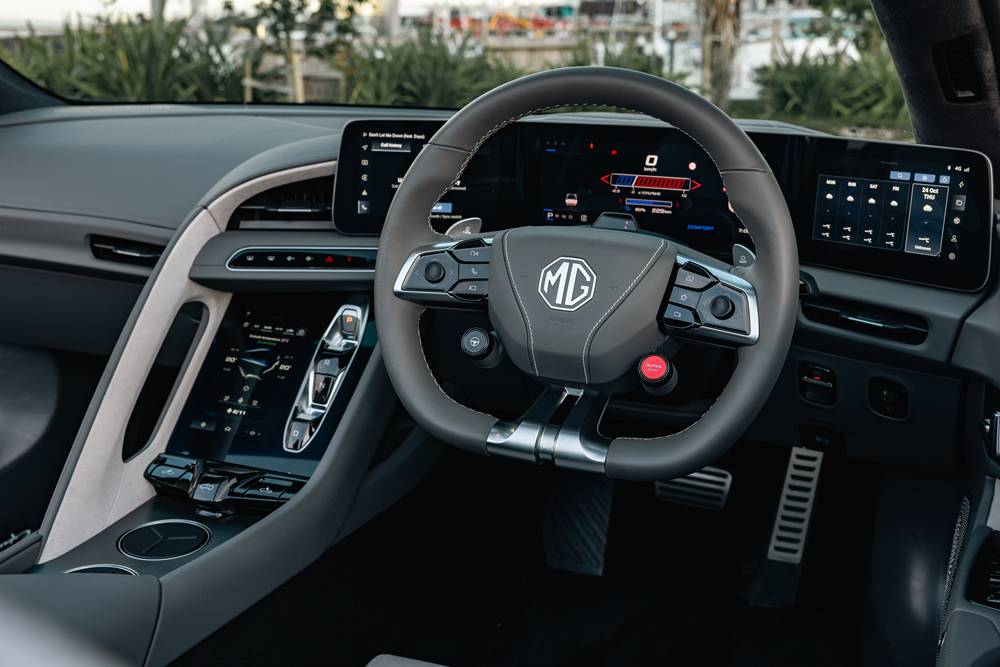 Inside, MG’s usual budget fare has been replaced by a surprisingly lush interior. There’s Nappa leather on the wheel and Notta leather (MG, call me — that’s trademarked now) and Sport Package Alcantara elsewhere . The triple-screen setup is pure Star Trek, though Charlie swears it’s more Eurovision: “Stunning, confusing, and slightly overwhelming.” Add to that a fourth screen in the centre stack which toggles between climate and drive modes — sometimes helpfully, sometimes not.