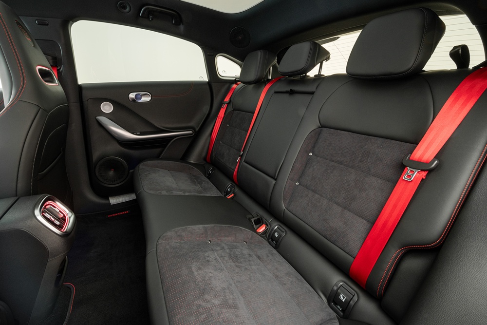 The interior has a funky vibe with ambient lighting you can set to all kinds of colours and effects. It feels premium without being covered in carbon, leather, or polished steel. The centre console is vented to keep drinks cool (yes please), and the Qi wireless charger is mounted properly so your phone doesn’t go flying when you launch it.