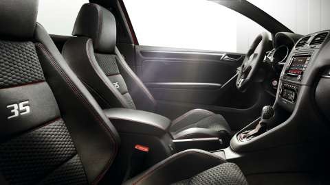 The interior was customised with the gear shift grip in the classic golf ball look of the first generation GTI, new decorative strips in the cockpit area and the door trim panels (“Black Array” type), special door sill plates with worked-in ‘35’logo, safety belts with red stripes and a ‘35’ integrated in the front head restraints of the top sport seats (“Jacky” style). As an option, customers can choose “Vienna” leather appointed seat upholstery in “Titan Black” combined with active-breathing microfibres (likewise black) for the centre seat panels.