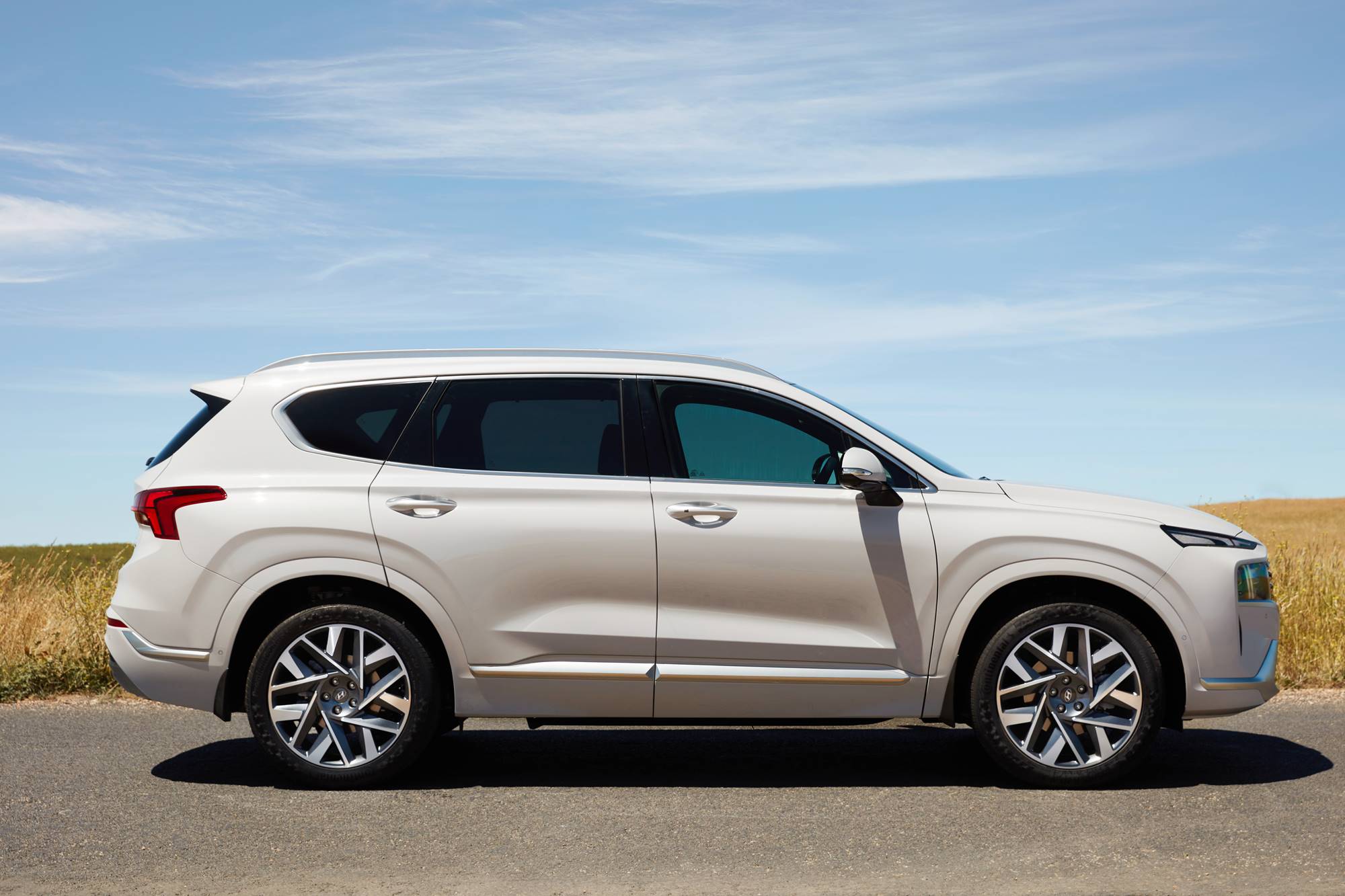 SantaFe is strongly masculine. The front end is dominated by LED arrays that look like someone roped down the sun, and an equally forceful rump. The tailgate has an automated power function, and passenger doors can be unlocked via rubber buttons on the front handles.