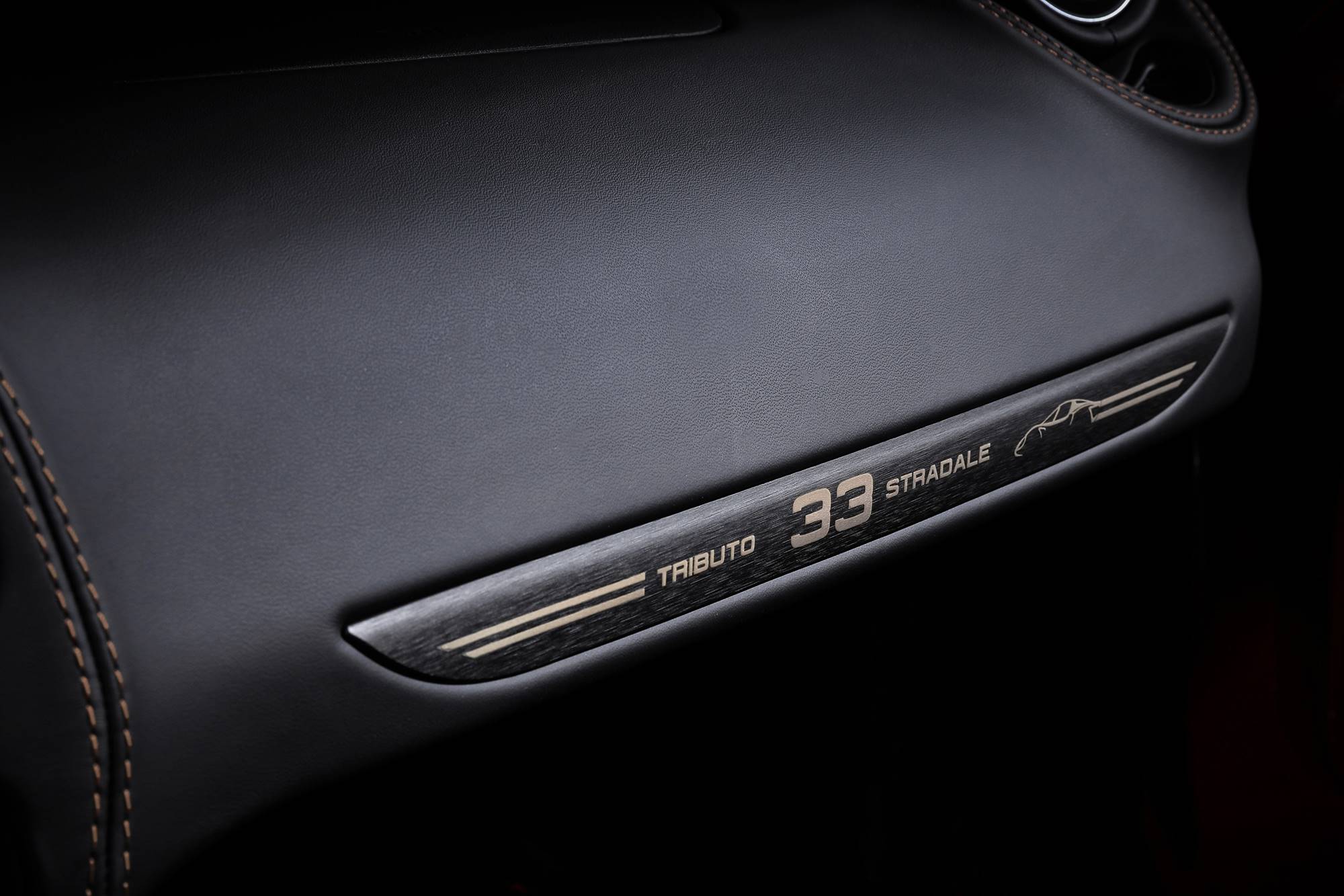 The cabin comes with a red carbon firbre tub, two tone seats, and a stitched leather upper dash. This is topped off by ‘33 Stradale Tributo’ inserted into the dashboard, and finally, each car comes with an individual number on the centre console.