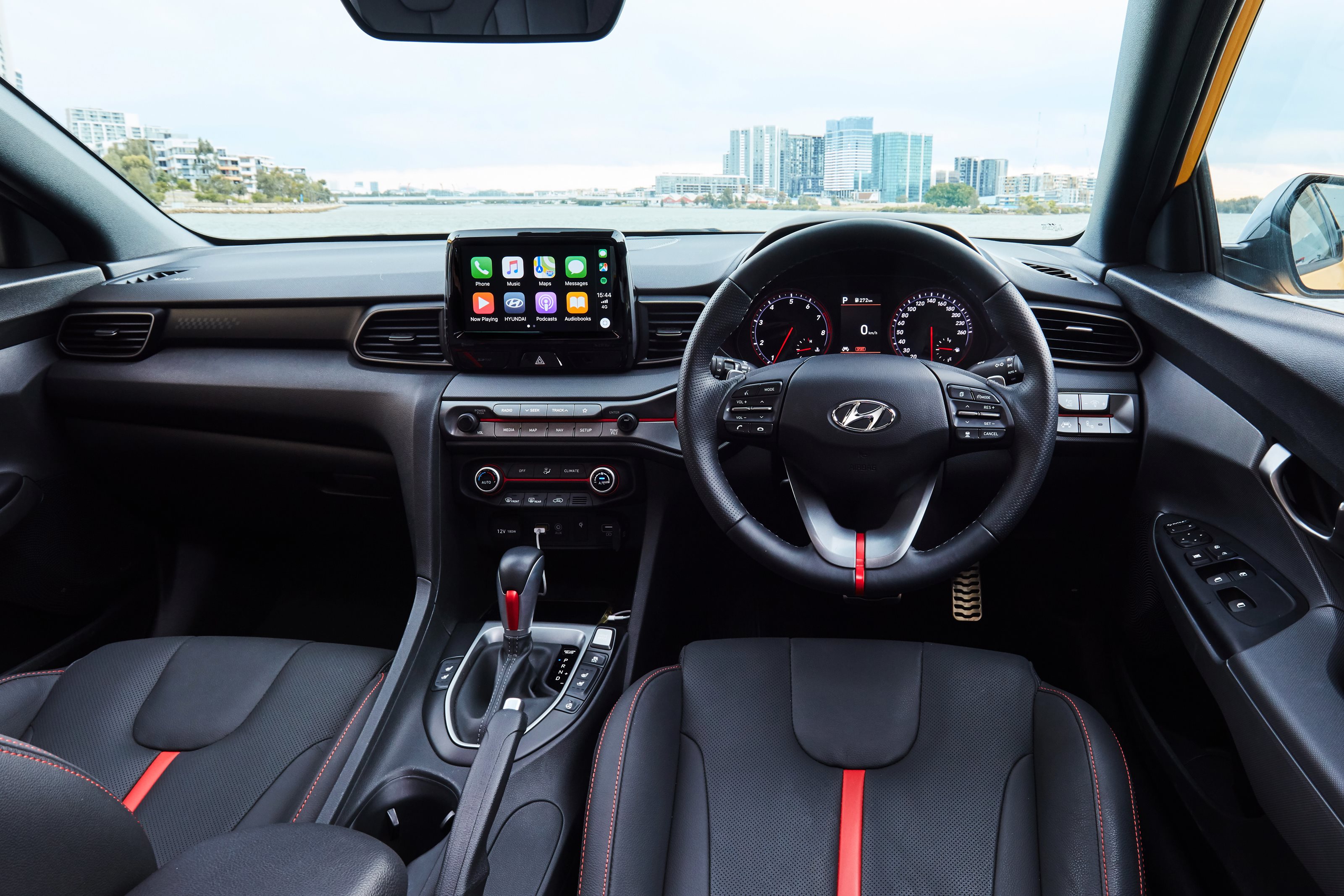 Styling is similar to the fabulous i30N with red highlights and fancy sports seats. They have big side bolsters for big cornering, and heating and cooling that help the dual zone climate control to keep the temperature just so. Rear seats are snug, with the centre position being replaced by a console with cup holders.