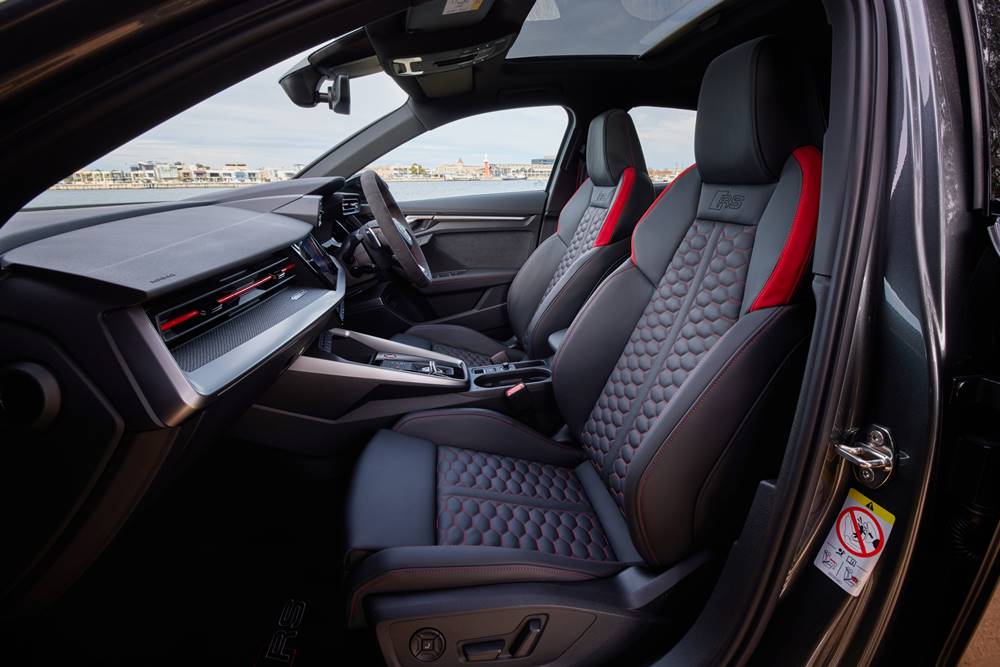 Inside Audi RS3 is an HUD, 12.3” driver’s display, and 10.1” feature across a new dash. Carbon fibre trim on the instrument panel, and nappe leather sports seats give the cabin an expensive look and feel.