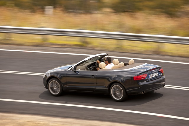 The A5 range has a coupe, convertible and fastback as family members and all have the same impeccable interiors. They have 1.8, 2.0 and 3.0 petrol and 2.0 and 3.0 diesel engines. For anything more powerful you’ll need to shop in the “S” models. For me, the fastback isn’t quite the success of the 2 door version but it is none the less popular. The cabriolet’s cabin has the same exclusive feel as its handsome exterior. The switch gear has the solid feel of quality and the leather comes from pampered cows who have never seen a barbed wire fence. And, there is lots of room too. The 2 VIP seats in the rear are deeply sculptured but like most big coupes wouldn’t be suitable for a really long journey, but for a circuit around town are just right. The front seats can also waft a cool breeze through the seat cushion on a hot day, and warm air at neck level on cool days.