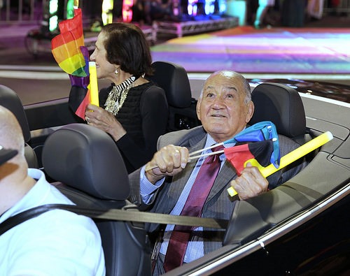Towards the end of the route the crowd thinned we chatted more informally, as if any of the drive had been formal. That is not the Mardi Gras way. Sir Nick told us how the couple met and pointed out Marie’s school as we passed Girls High. He tapped my shoulder again pointing out the stand in his name at the football stadium. They couldn’t be prouder. Dame Marie said “you wouldn’t want to live anywhere else. Nowhere does a party like Sydney”, and she is right. As quickly as it had begun, the parade finished and we found ourselves at the end. I told the couple that I had been asked to drive them back to Taylor Square to view the rest of the parade. Once Dame Marie was seated properly We prepared to head back. I asked her if she preferred the roof up or down. “It is a beautiful night. Let’s have the roof down. I don’t want to miss a thing” said Dame Marie.