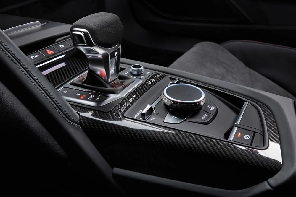 the RWD is 20 kilograms lighter, as 1570 kilograms. Its 20 inch, 10-spoke wheels have high-performance Michelin Sport Cup 2 tyres which good for road and racetrack use. Ceramic braking is standard equipment in the R8 GT, as are the bucket seats, performance sports suspension, and the CFRP anti-roll bar. The front anti-roll bar is carbon fiber reinforced plastic, with the two coupling rod connections made of red anodized aluminum