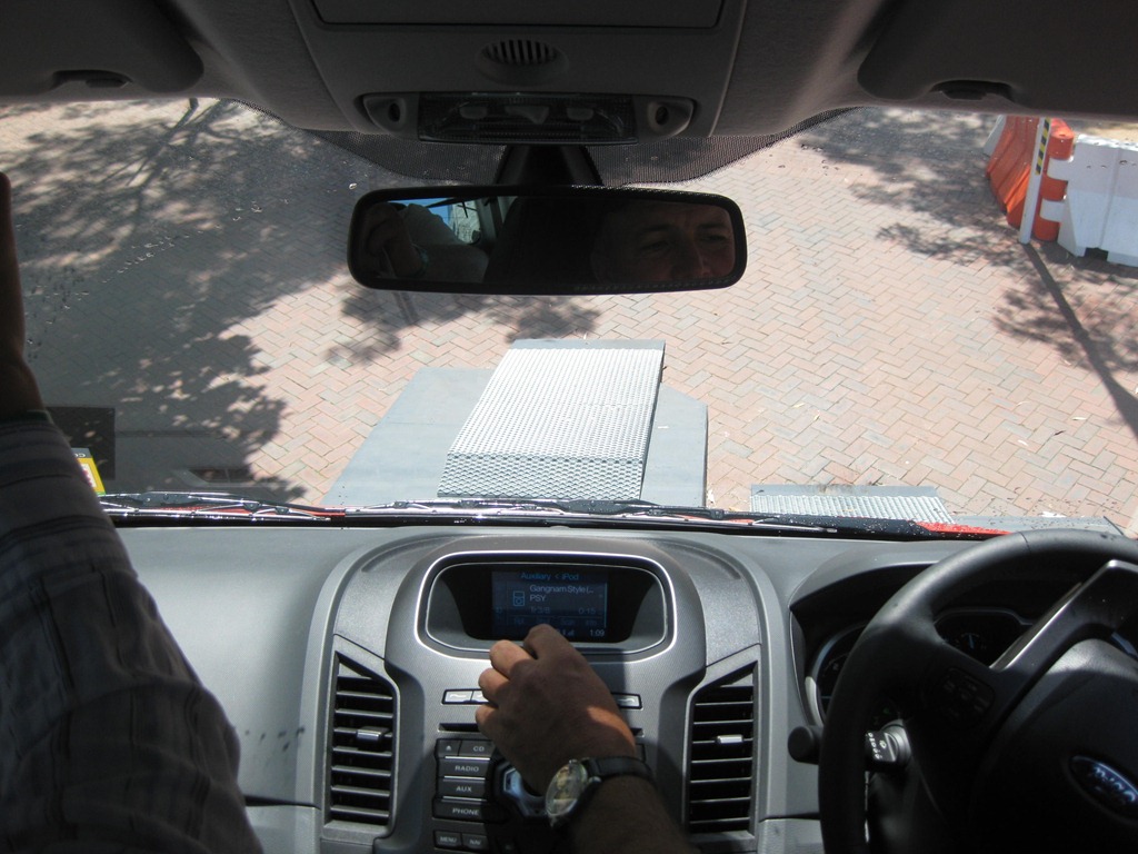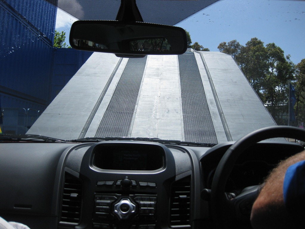 For a bit of effect a Ranger was taken through its paces by driving up a 45o angle, along the top of shipping containers 2 stories high and 45o down the other side. Cameras click away like type writers inside as we tilted at crazy angles. We shot a couple of snaps to show how extreme it was from way up there.