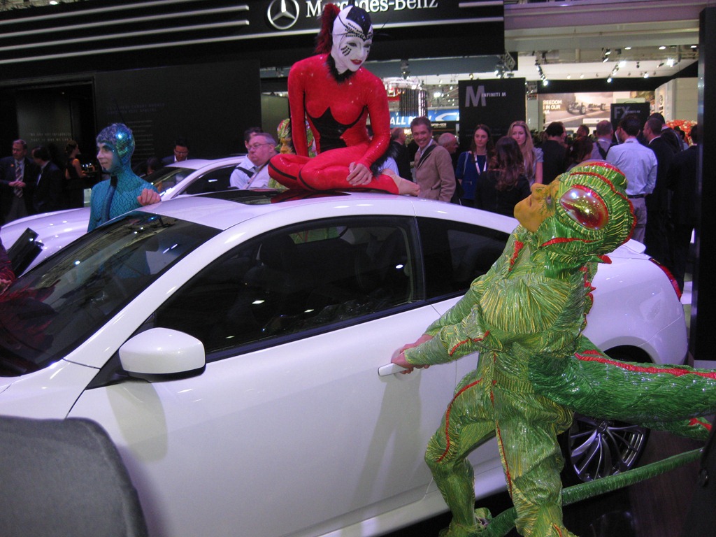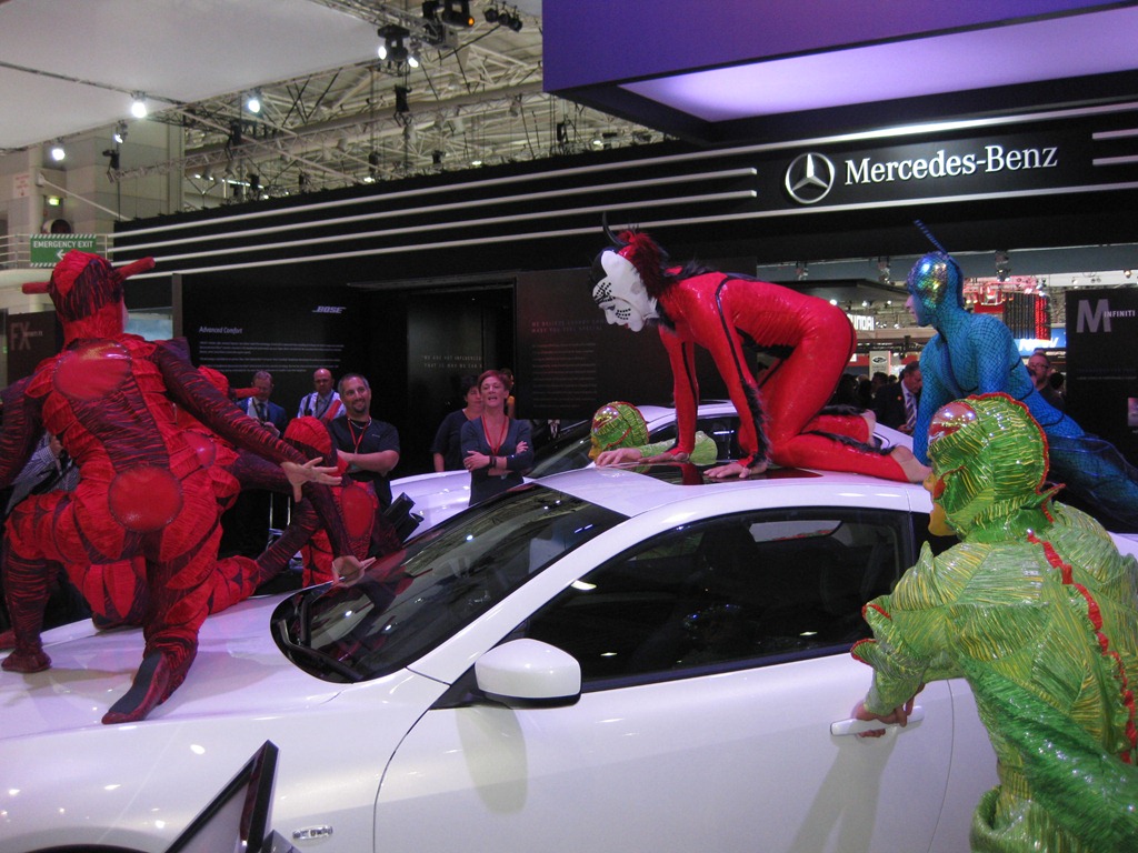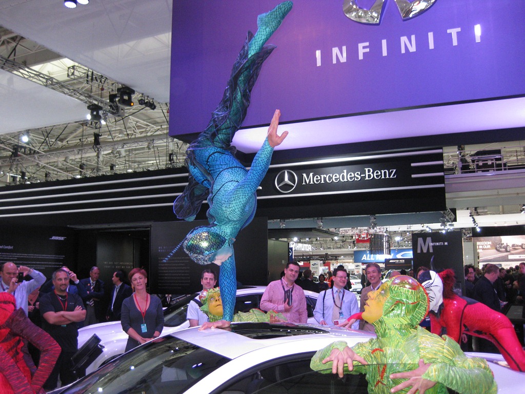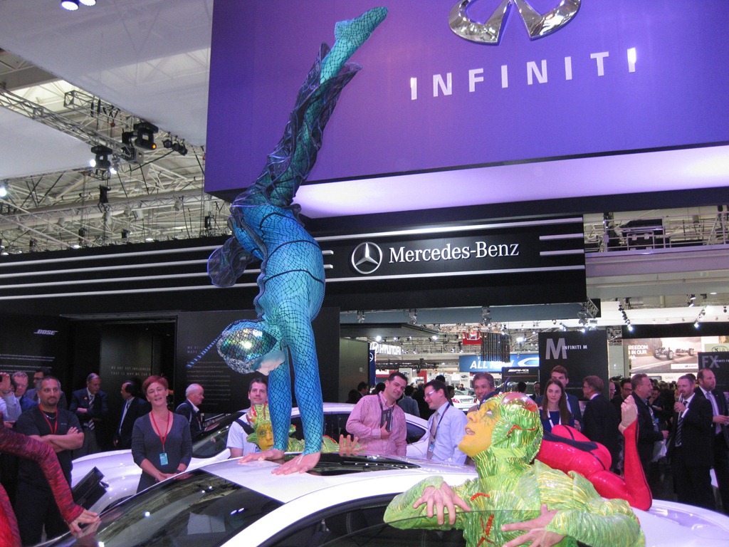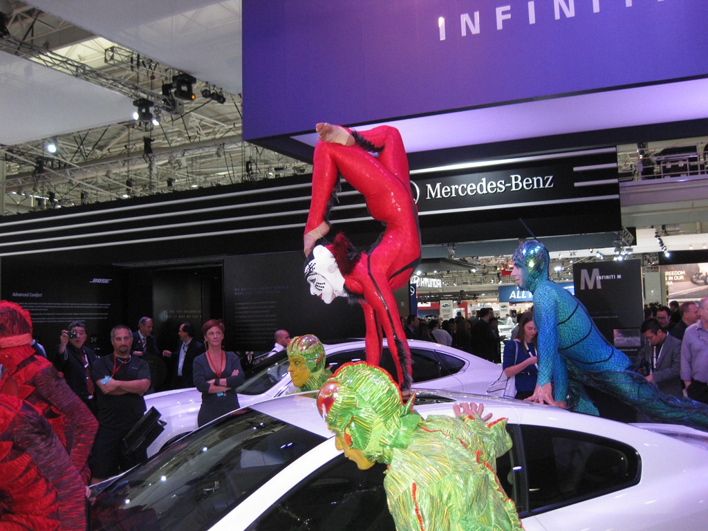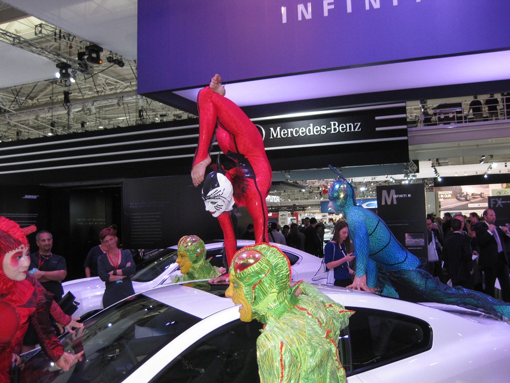 The entire Infinite range debuted accompanied by members of the Cirque du Soleil. The sexy Infinite G coupe was spotted with acrobats perched in precarious positions on top and inside the car.