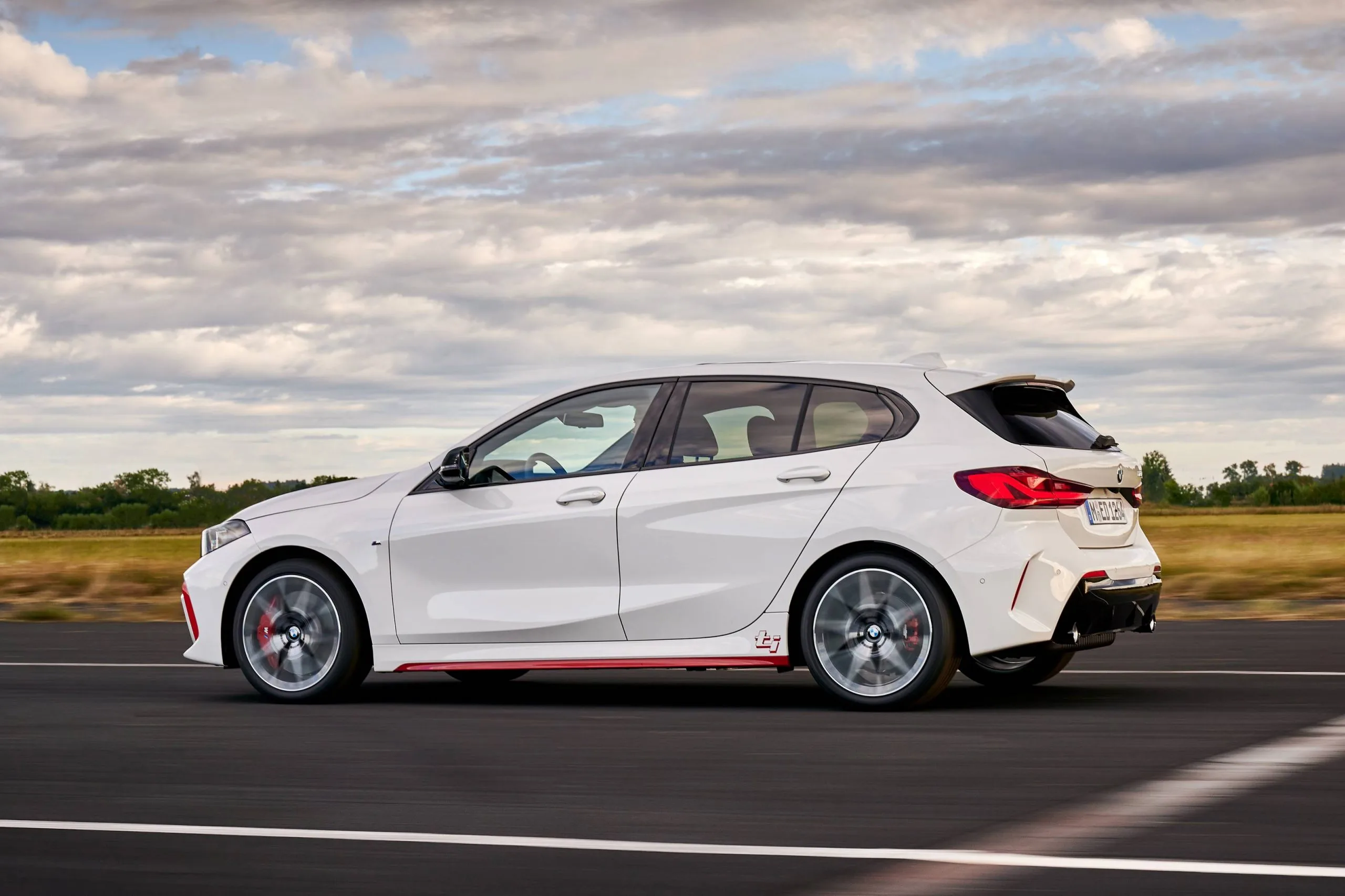 The side skirt trim and “ti” badge located above it ahead of the rear wheels are also red on examples of the BMW 128ti with Storm Bay metallic, Mineral Grey metallic, Sapphire Black metallic and Alpine White paintwork.
