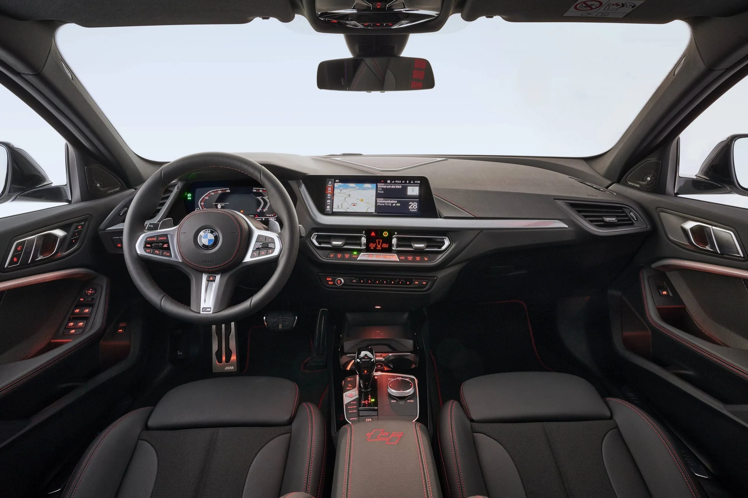 The interior of the BMW 128ti features premium materials and extends the use of red accents from the exterior.