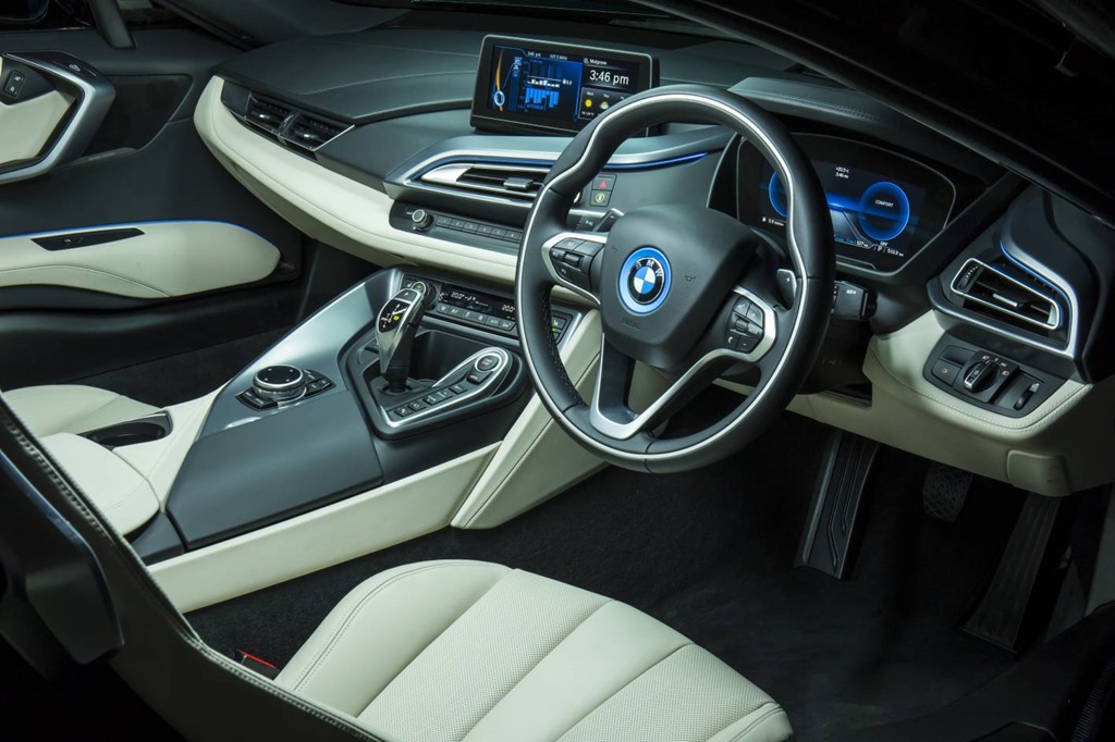 The i8 has a small 1.5L twin turbo petrol engine and an electric motor running on batteries. There is a second electric motor which acts as a generator for the batteries and this is where it gets interesting. The batteries are charged by a wall charger, or by braking/coasting or by the petrol engine. If you were to spend half the day in SPORT mode, you’d find you had yourself a near full charge. Although you only get about 30km, it’s fine for commuting. You’d have a fast charger at either end of your journey for an 80% top-up. Most people only travel to work, but if you have a longer journey, the petrol engine cuts in so no range anxiety. It sounds complex and unless you’re an engineer, most of us have little chance of more than a casual grasp on the propulsion tech.
