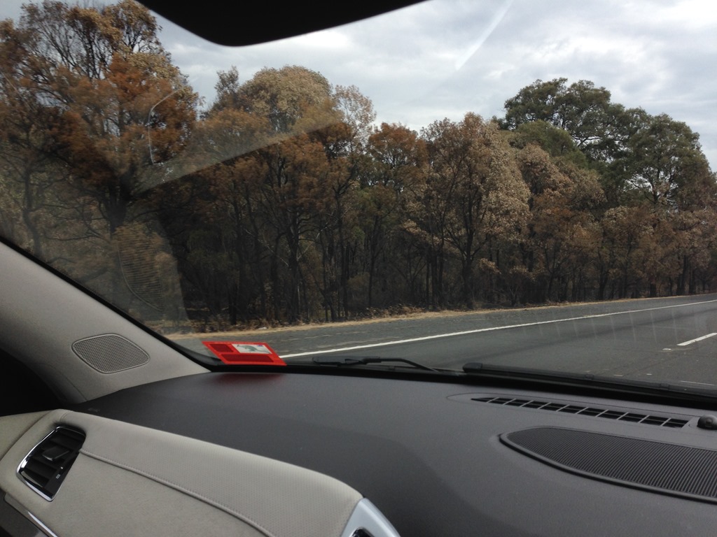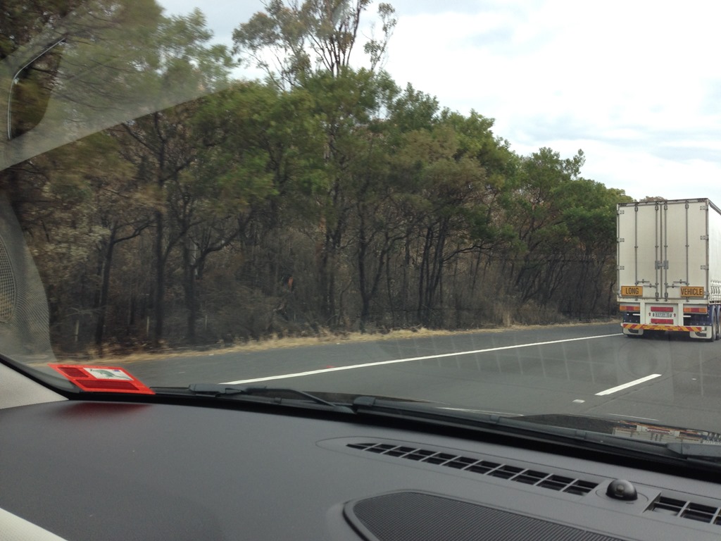 BELOW: Fire damage along the Hume Highway west of Sydney