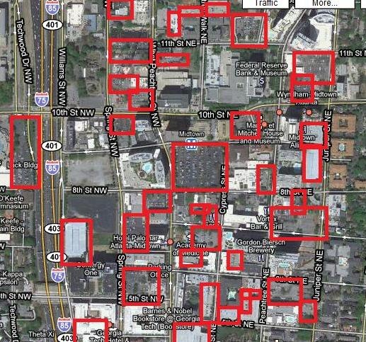 Red Squares Indicate Land that is 100% Dedicated to Parking in Midtown Atlanta