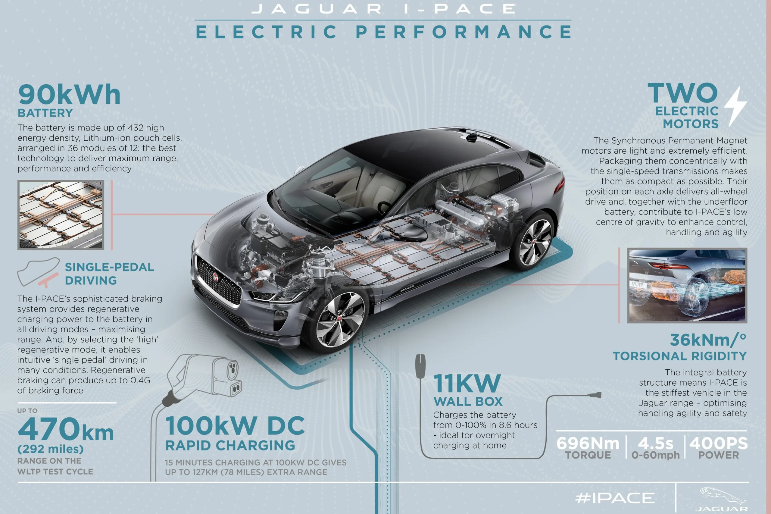 With two Jaguar-designed electric motors at each axle, producing exceptional combined performance of 400PS and 696Nm, aluminium construction and a low centre of gravity, the I-PACE offers an unrivalled balance of all-wheel drive performance, refinement, luxury and agility – together with outstanding real-world range and day-to-day usability.