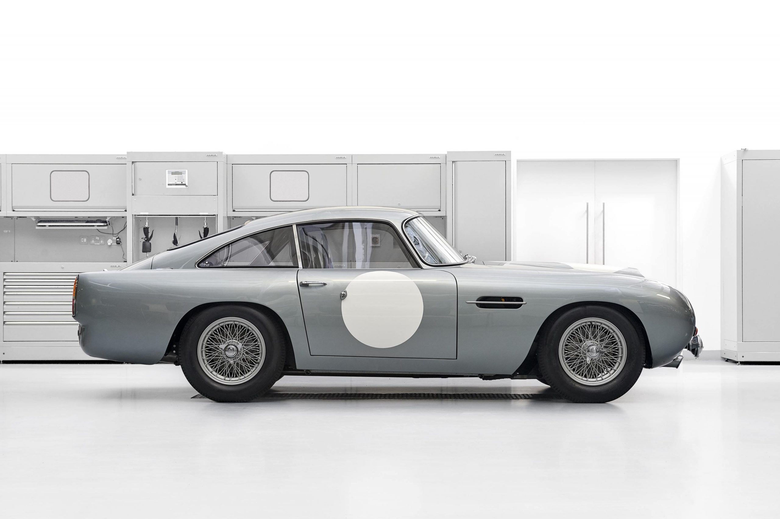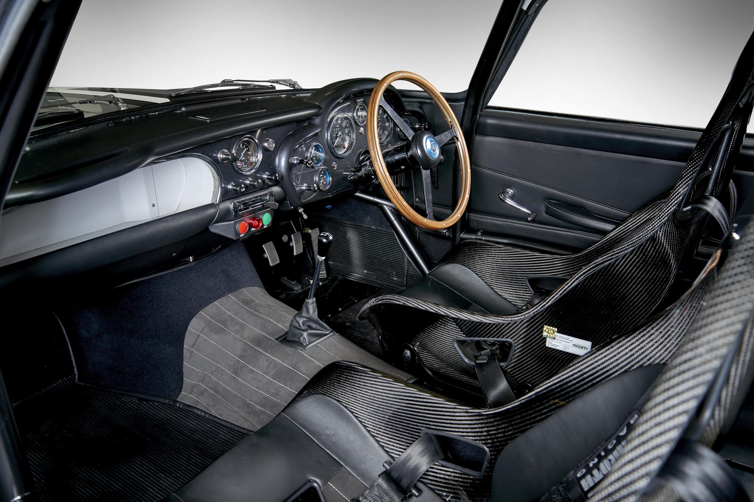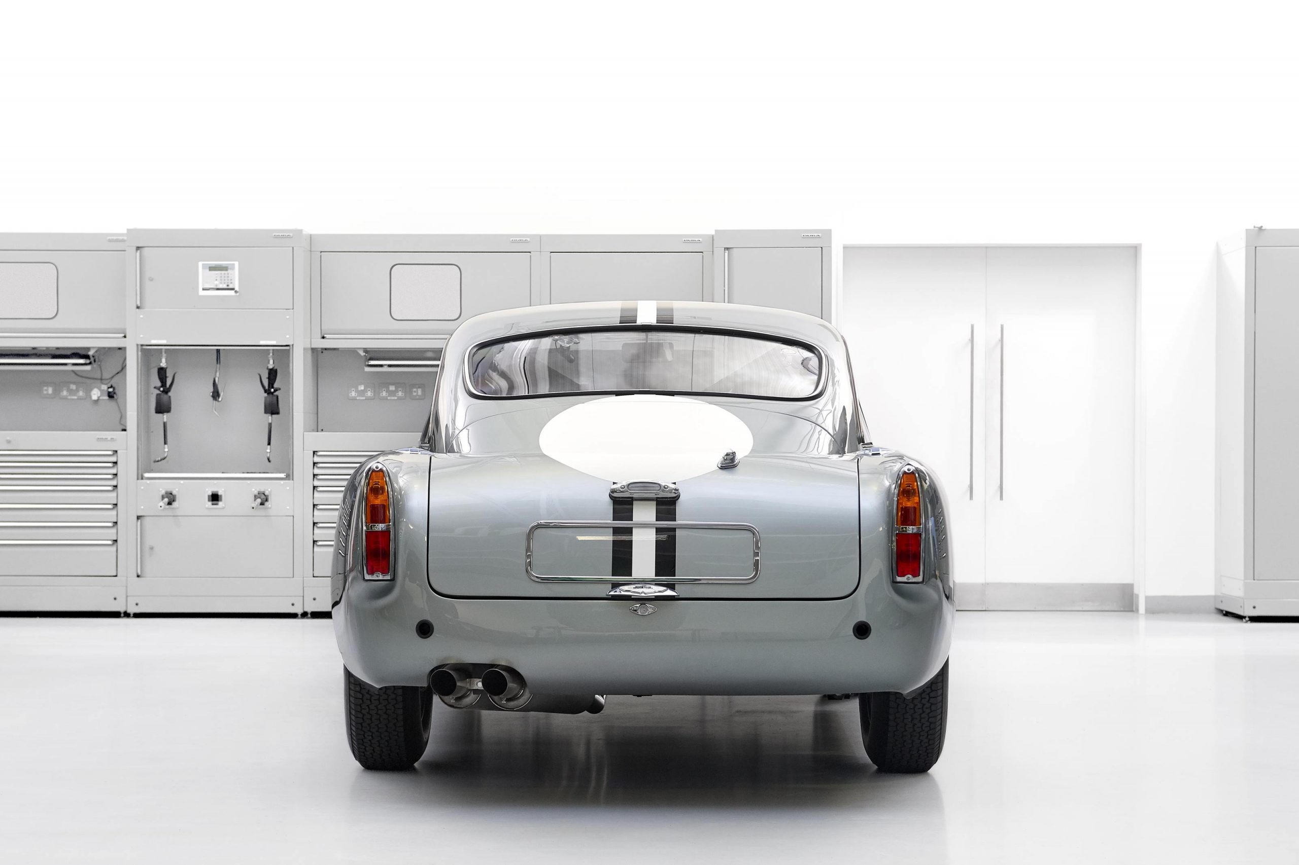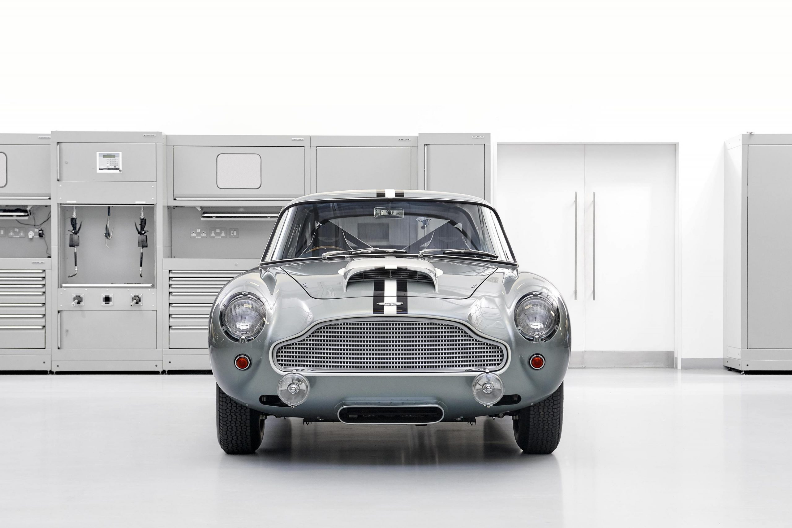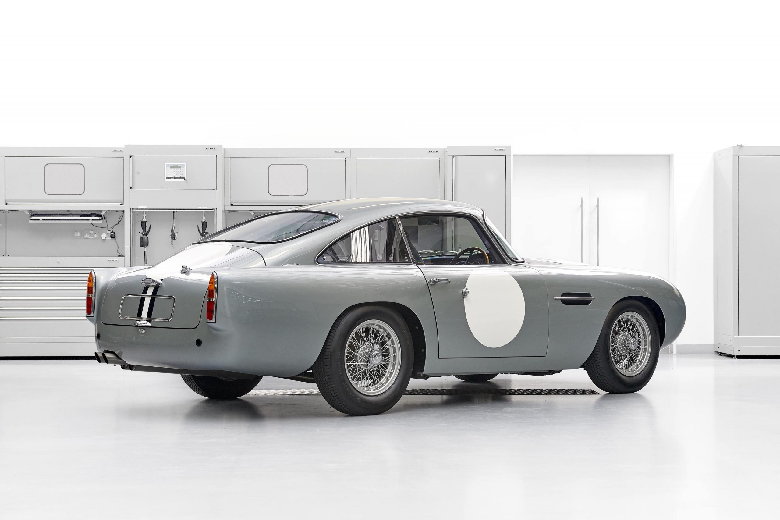 This Snow Shadow Grey sports car is adorned with a hand-painted triple stripe (black, white, black) and comes complete with all the usual racing accoutrements associated with a DB4 GT Continuation car.