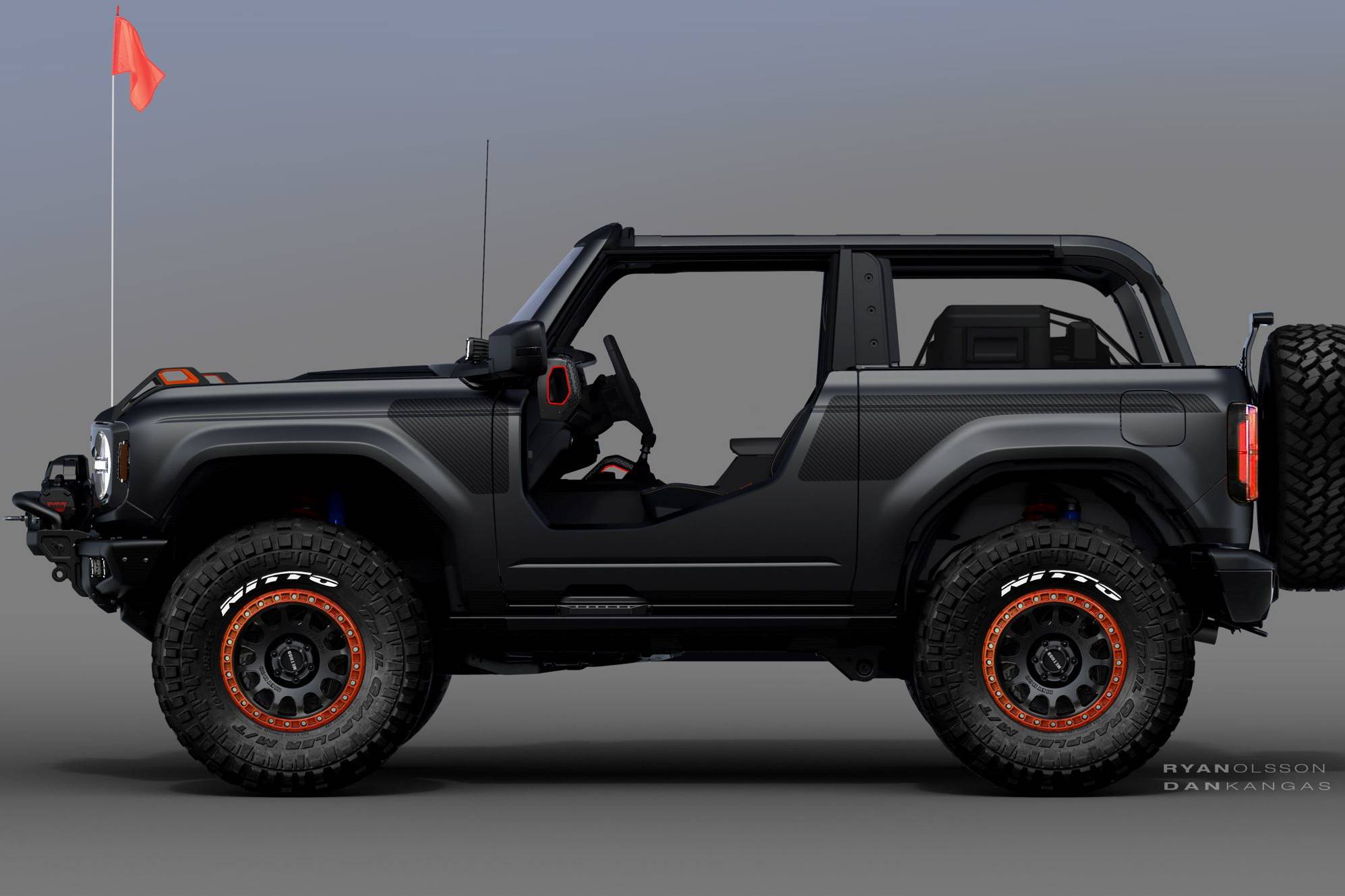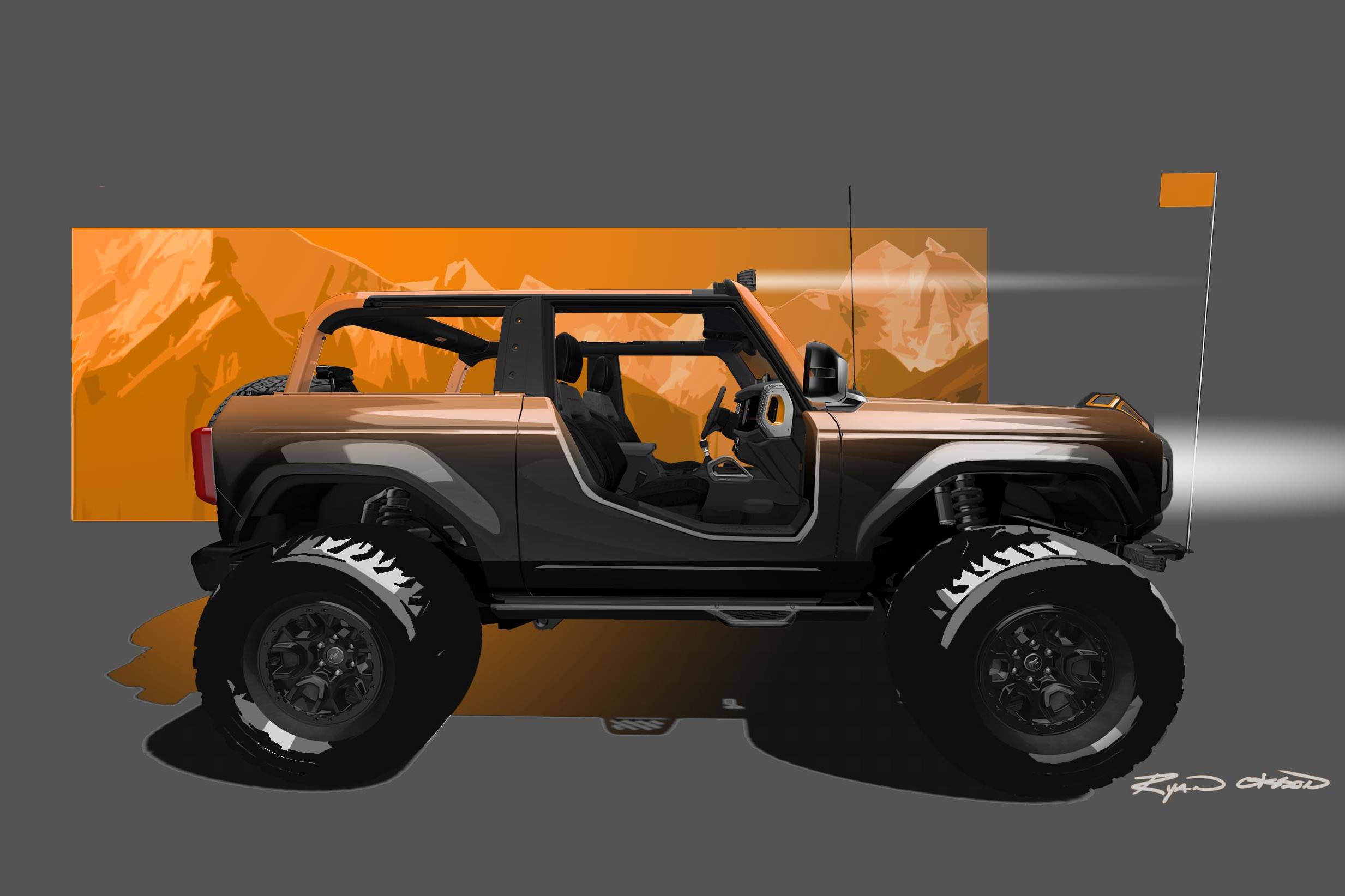The Ford Bronco Badlands Sasquatch 2-Door Concept reveals Bronco’s modularity. This concept is built around one of the Bronco program’s customer-use scenarios, in which a comfortable Monday through Friday Bronco is converted for a weekend of extreme off-roading, and then back to stock Badlands spec for the week ahead. Instead of the potential damage to Bronco’s factory-equipped body parts, Bronco brand’s Built Wild innovative design process enabled the concept to have swappable front fenders and rear quarters. Easy to install before a trail ride, and removable, these concept accessory parts are made from robust and impact-ready materials that replace stock painted parts. And for a throwback cue to the first-generation Bronco U13 Roadster model, the Bronco features a tough stepover replacement panel for maximum thrill and open-air feeling instead of traditional doors. 3D-printed titanium parts strip weight and increase strength.