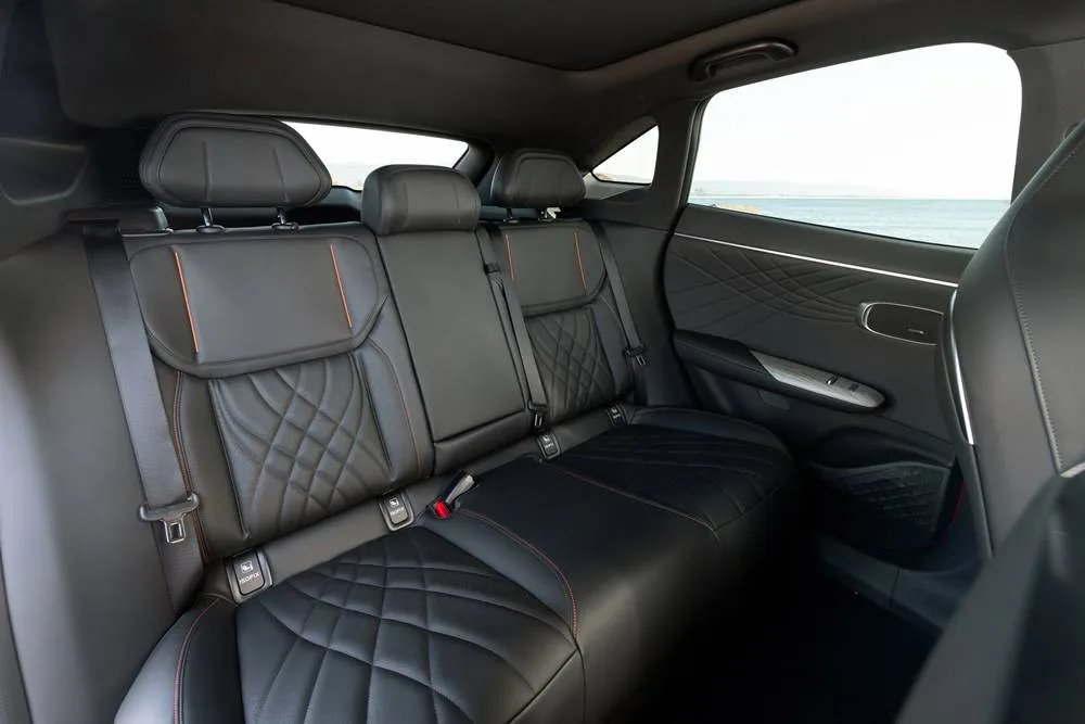 The rear control screen does the front passenger seat, overhead shade, and climate, but is difficult to see even with the overhead shade closed. The airy cabin is topped by a fixed glass roof whose shade has to be closed on a 42c day, with the glass being too hot to touch. The climate control struggled to cope – even with the seat cooling at full rip.