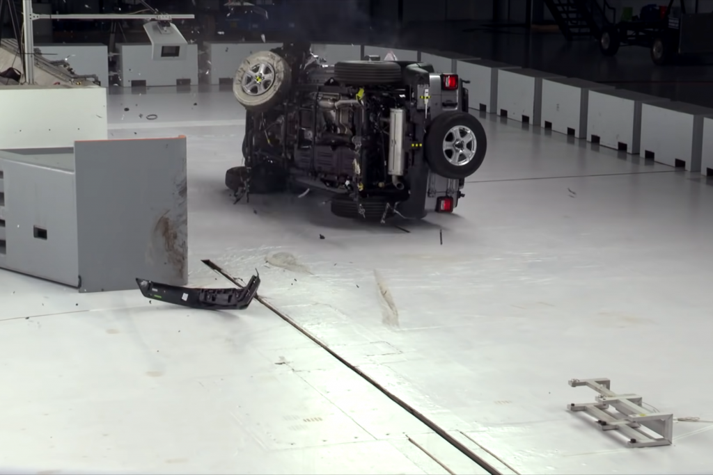 Above: Jeep Wrangler tipped over during crash tests though. SEE THIS article in Jalopnic.