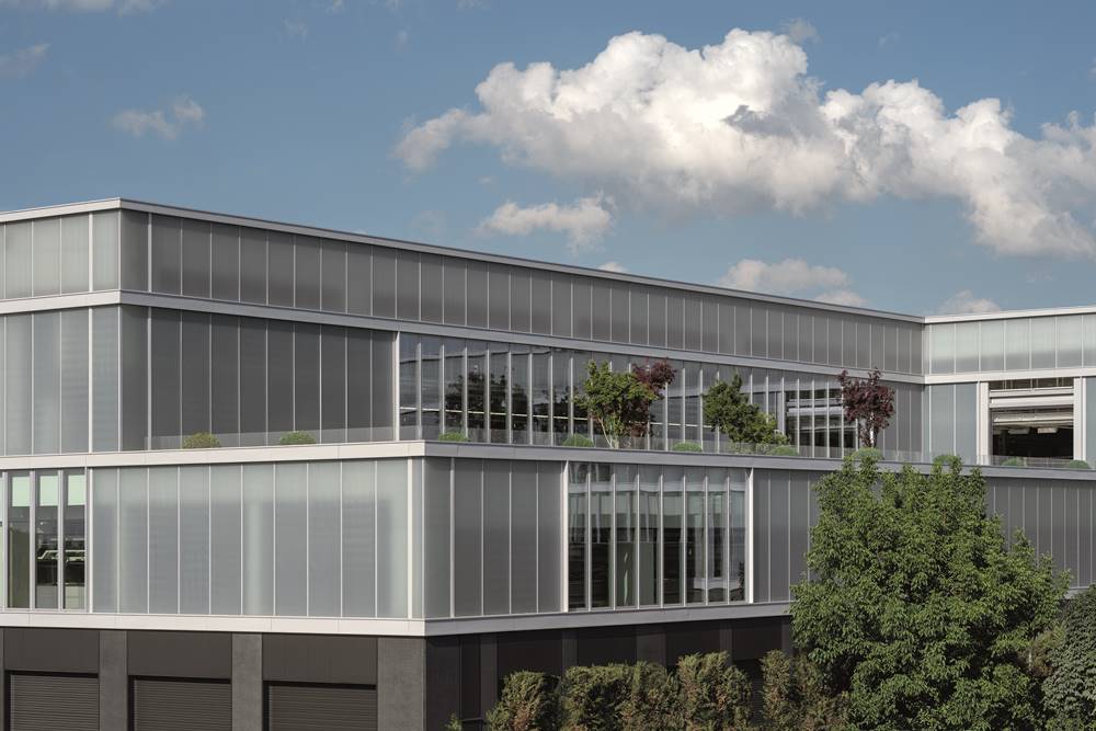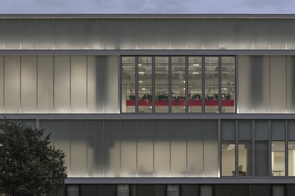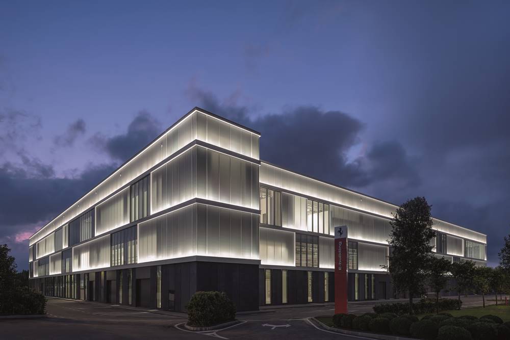 The e-building was designed by MCA – Mario Cucinella Architects in collaboration with Ferrari. it features a rectangular shape with a distinct façade of opaline glazing and clear glass, resembling a glowing lantern at night. The design and manufacturing of the façade components followed Design for Manufacturing and Assembly (DfMA) principles, ensuring cost efficiency and reduced environmental impact.