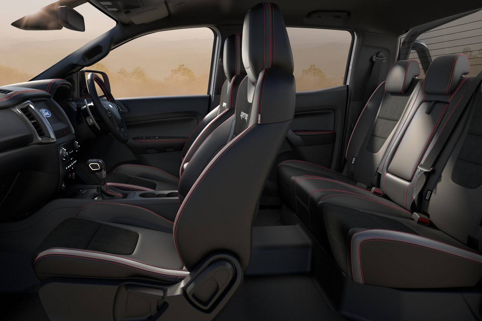 On the inside, Ranger FX4 continues the sporty theme set by the exterior with leather-accented sports bucket seats boasting an embossed red FX4 logo in the seat back. This complements the Race Red contrast stitching on the steering wheels, gear selector, hand brake boot, door trim and FX4-branded front floor mats.