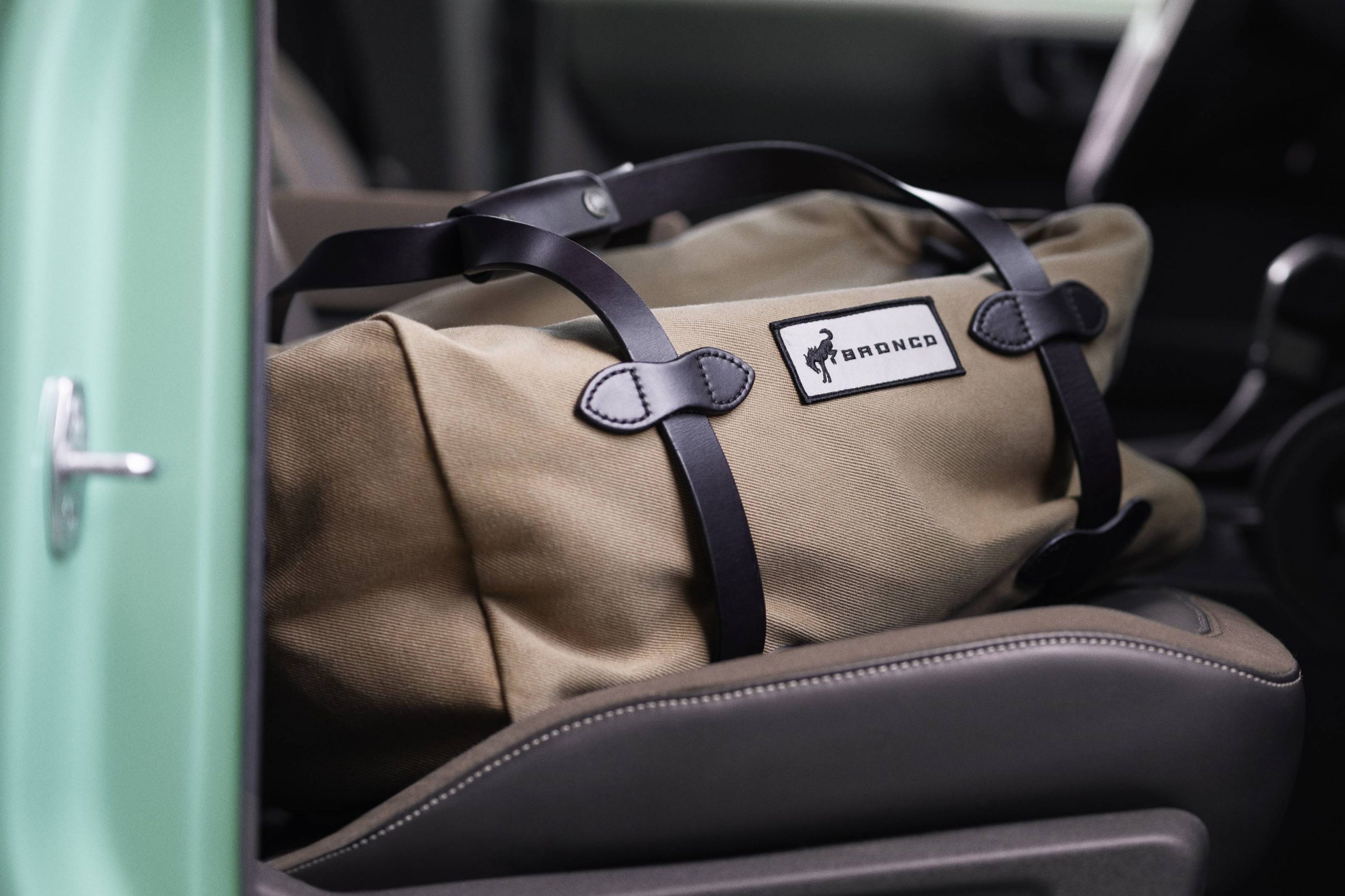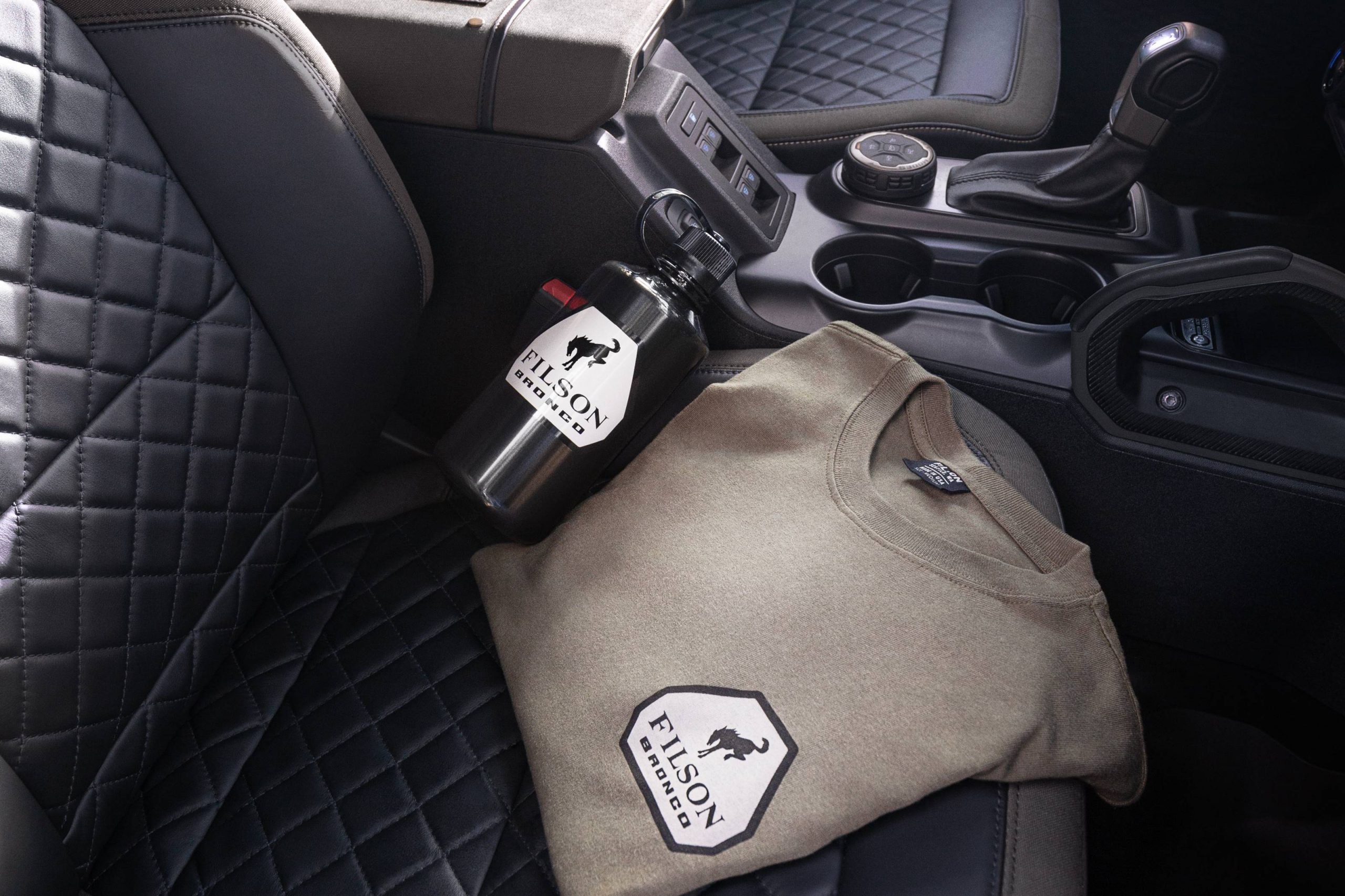 The steering wheel features a Bronco horse logo plated in Filson brass, while an embroidered Filson logo is mounted to the interior top and a similar logo is applied to the center console trim tag.
