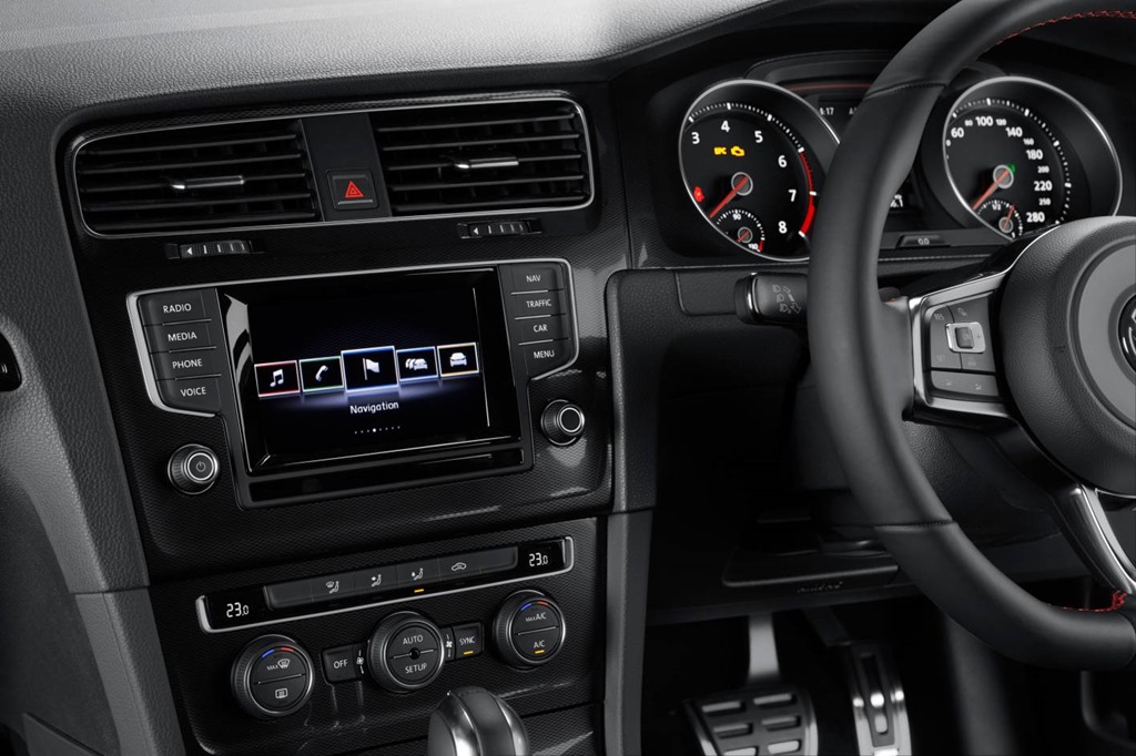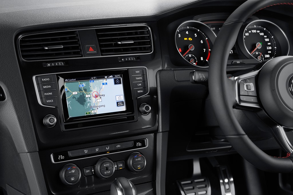 Golf MK VIII GTi med res (6)The infotainment system is set into the dash surrounded by piano black and soft plastics. It’s very tasteful and elegant. The hi-res screen responds quickly to inputs with some of the buttons at the sides duplicating onscreen options. Joy of joys, the steering wheel buttons are all backlit so no more night Golf MK VIII GTi med res (7)time fumbles unless you have someone particularly hot sitting beside you. One thing I really like is the auto-hiding menu bars. In most functions a menu will appear with options for input. After a short while it hides but waving a finger near the screen will bring it forward again. It’s brilliant.