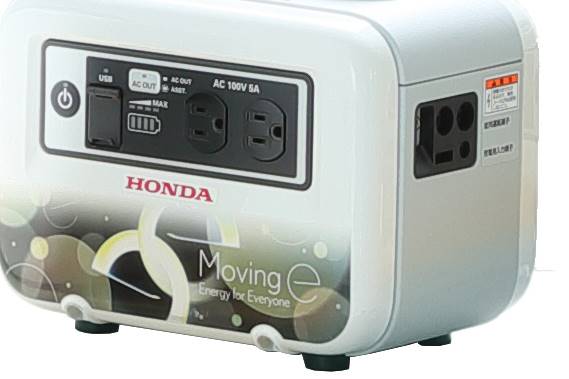 In case of power outage during a disaster, this large capacity enables the Moving e to supply electricity in indoor areas such as an evacuation centre, as well as inside vehicles by storing electricity generated by the CHARGING STATION in large capacity portable batteries, namely Honda Mobile Power Packs and LiB-AID E500 via the Power Exporter 9000.