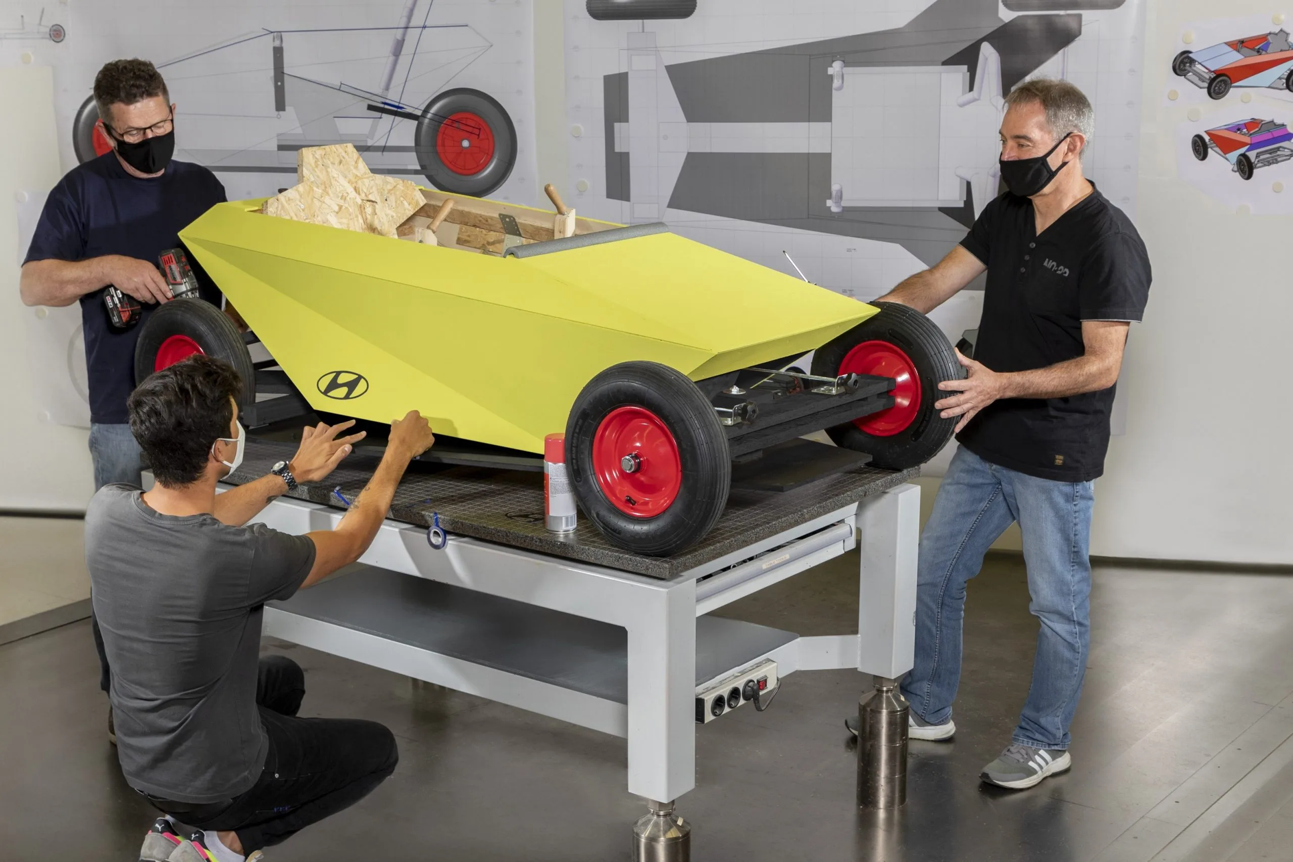 The Hyundai Soapbox was designed just like a regular car. First, a team of engineers built the chassis. Then, a team of designers sketched ideas, first on paper and then as 3D computer models. They came up with different designs, chose one, and started building. Lastly, another team worked on colour and trim.