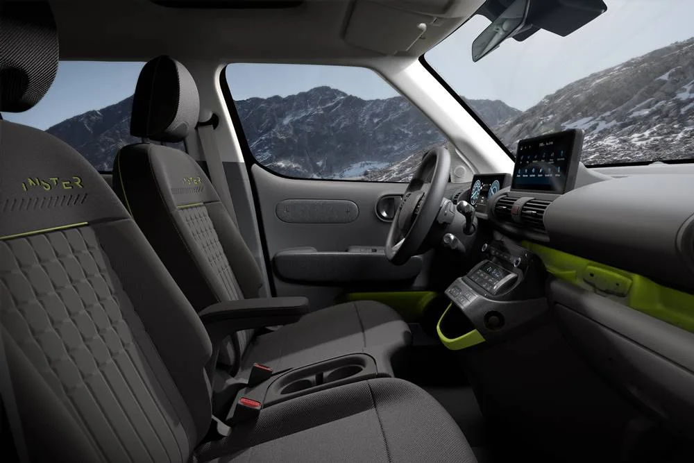 The INSTER is packed nifty touches such as the 10.25-inch digital instrument cluster and matching infotainment screen. Wireless charging and pixel-themed graphics on the steering wheel boss give the cabin bit of polish. INSTER’s front-row seats offer walk-through access, while both front and rear seats fold flat, opening up a range of storage configurations.