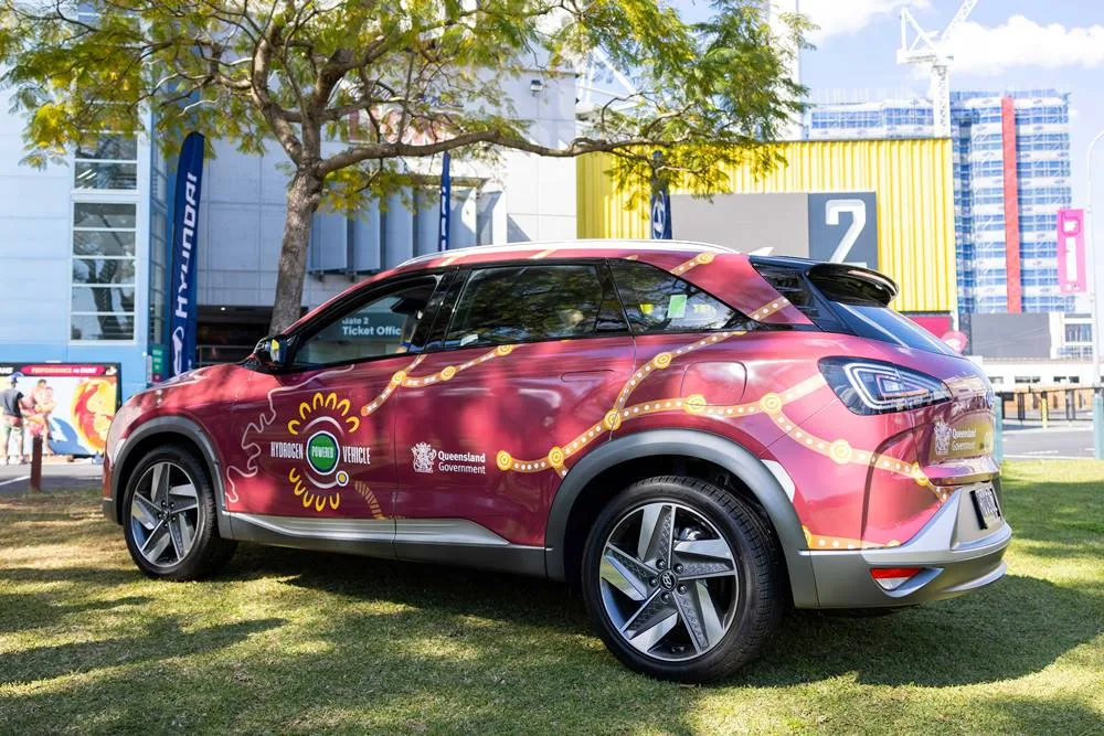 The NEXO fleet has an eye-popping Indigenous-inspired wrap with a hydrogen nucleus and the Brisbane River (Maiwar), created by Brisbane-based Indigenous-owned creative company Iscariot Media.