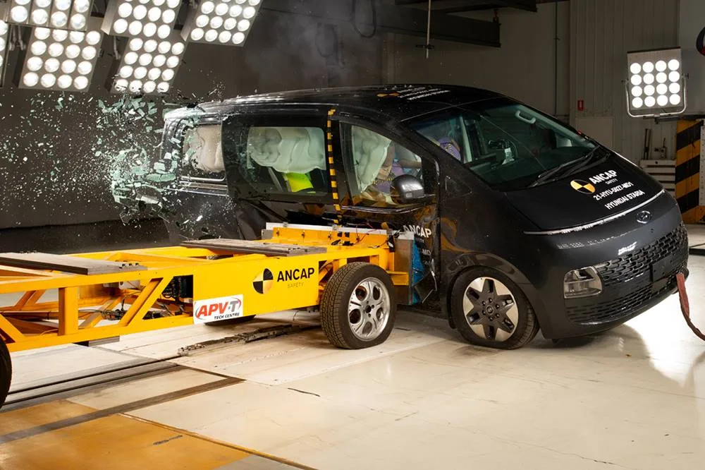 Hyundai Staria is an eight-seat people move, and scored well across all areas. full points awarded in the side impact test for both adult and child occupants, and for the driver in both the full width frontal and mobile progressive deformable barrier (MPDB) tests. Submarining of the rear passenger’s upper legs was noted in the full width frontal test and deductions were applied, however the vehicle still scored well in this test overall.