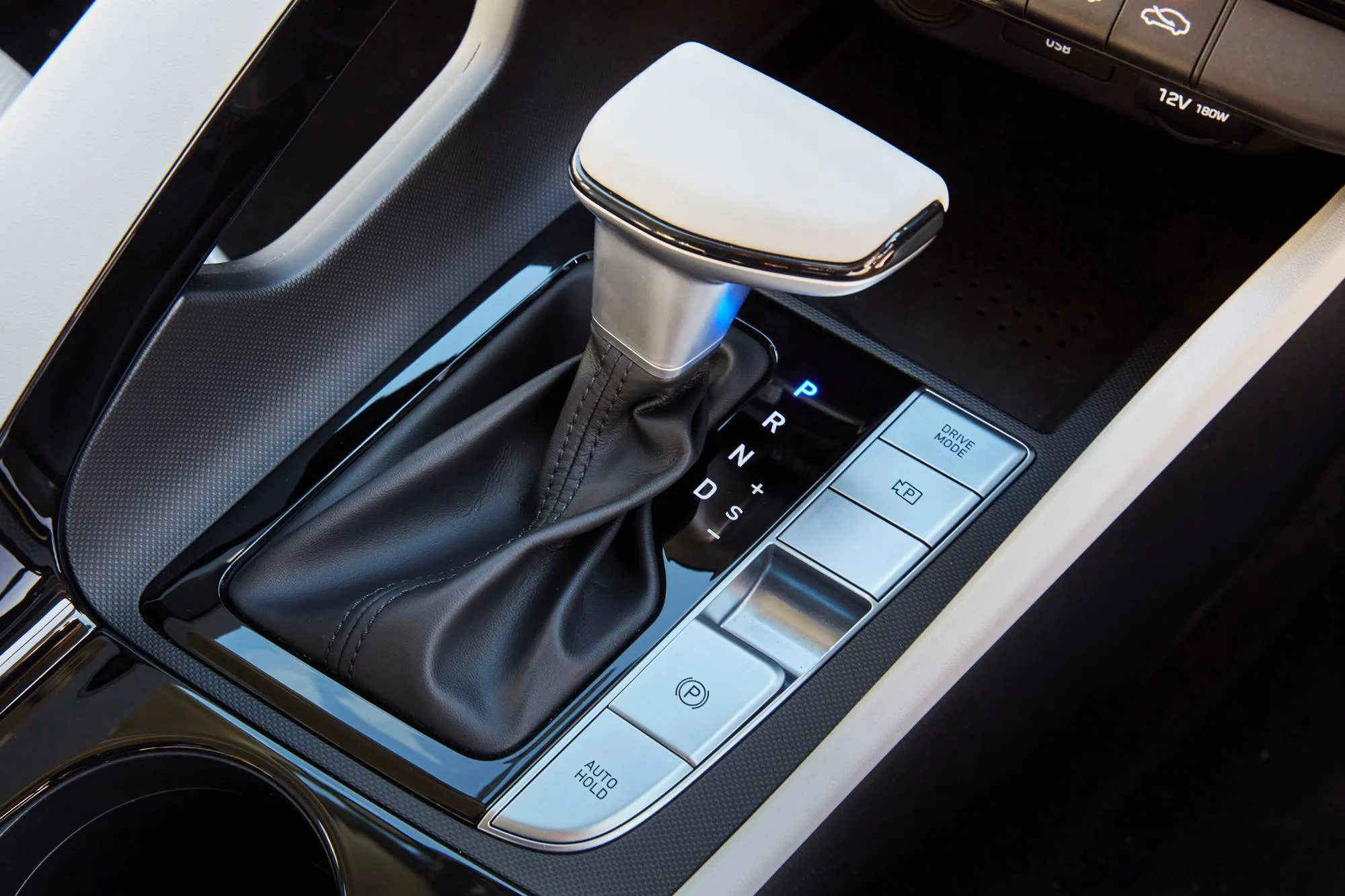 The centre console has 2XUSBs and a power outlet cradled within. A Qi charger rests just below them, but is partially concealed by the gear selector.
