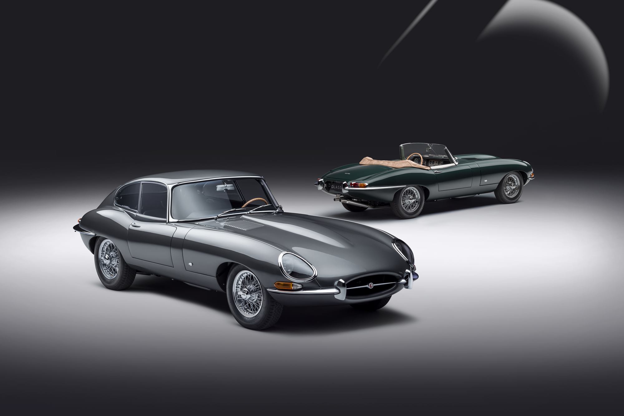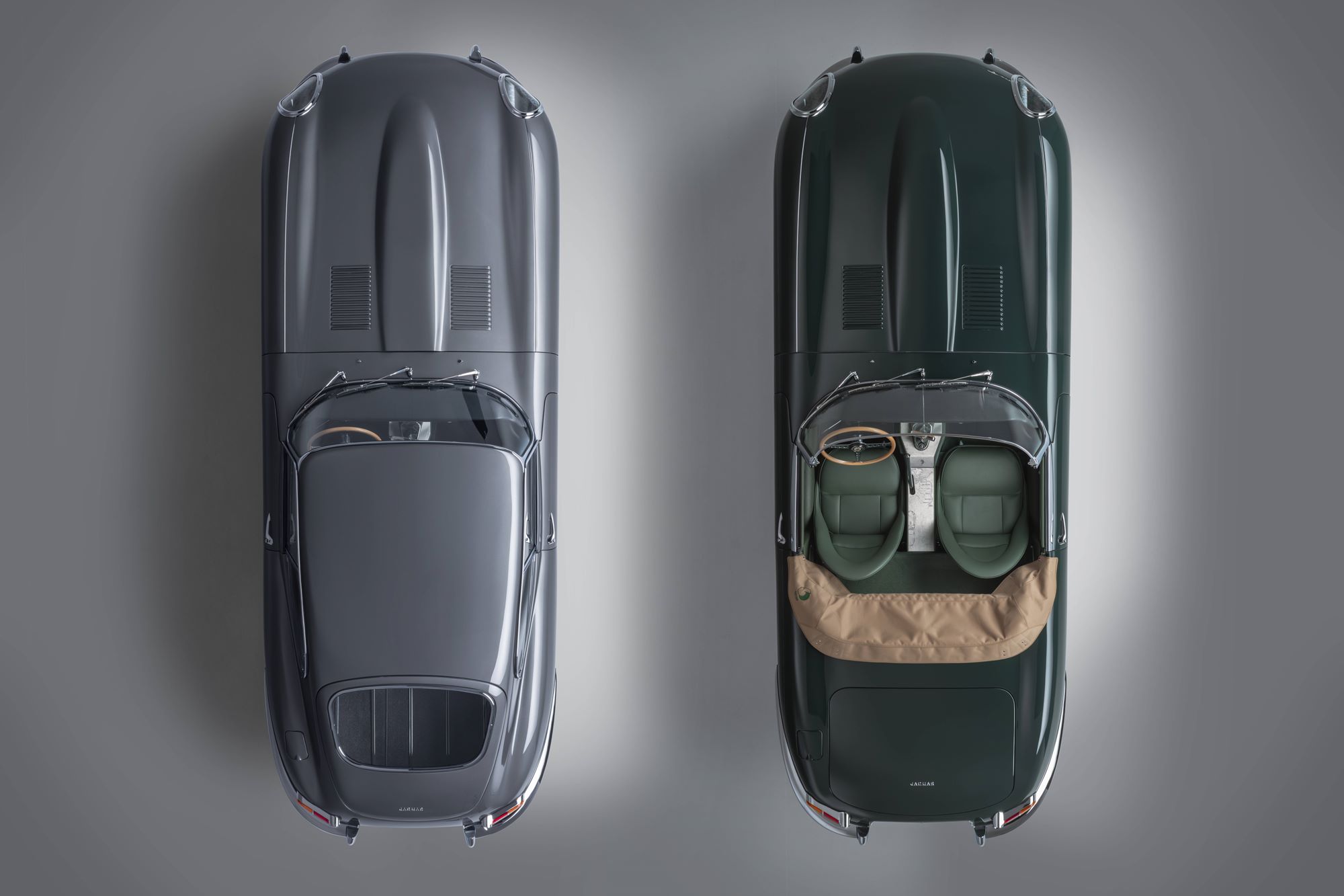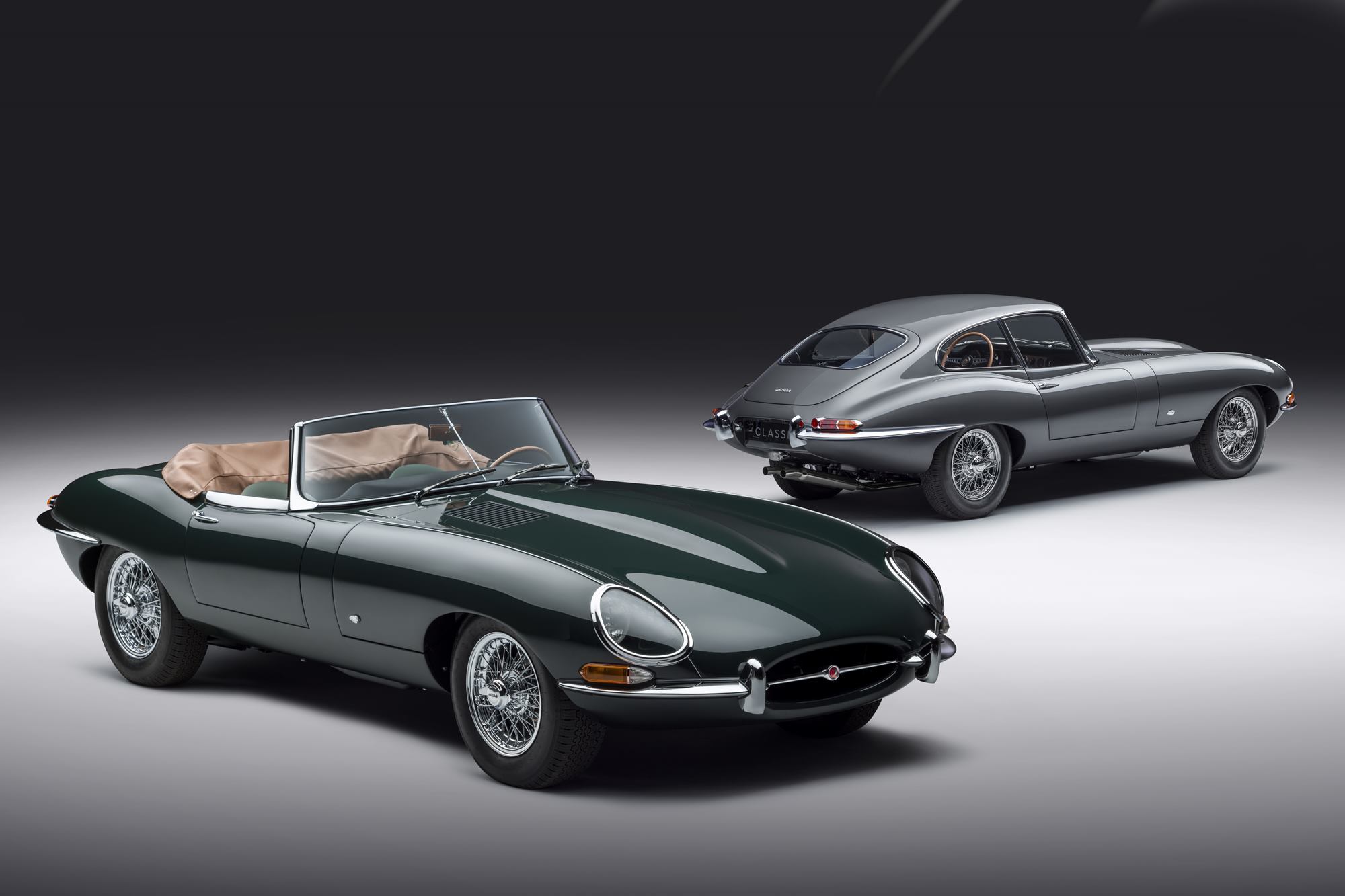 Six decades after the world debut of the E-type in Geneva, Switzerland on March 15, 1961, the E-type 60 Collection pays tribute to these two legendary vehicles: the Opalescent Gunmetal Grey coupe ”9600 HP,” driven by publicist Bob Berry to make the launch itself, and the British Racing Green roadster “77 RW,” driven by Jaguar test driver Norman Dewis who was told to “drop everything” to get to Geneva the next day.
