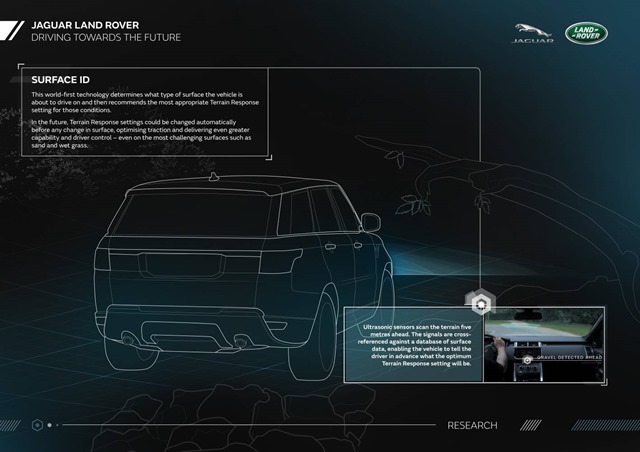 Ultrasonic sensors can identify surface conditions by scanning up to five metres ahead of the car, so Terrain Response settings could be automatically changed before the car drives from tarmac to snow, or from grass to sand. This will optimise all-terrain performance, without loss of momentum or control.
