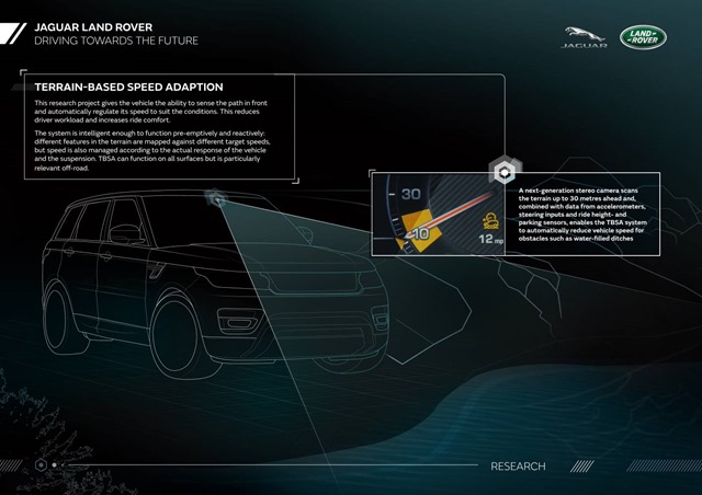 Sensors could also be used to scan the roughness of the road or track ahead and adjust vehicle speed. TERRAIN-BASED SPEED ADAPTION (TBSA) uses cameras to sense bumpy terrain including uneven and undulating surfaces and washboard roads, potholes and even standing water. It is then intelligent enough to predict the potential impact of these surfaces on the car’s ride and automatically adjust speed to keep passengers comfortable.