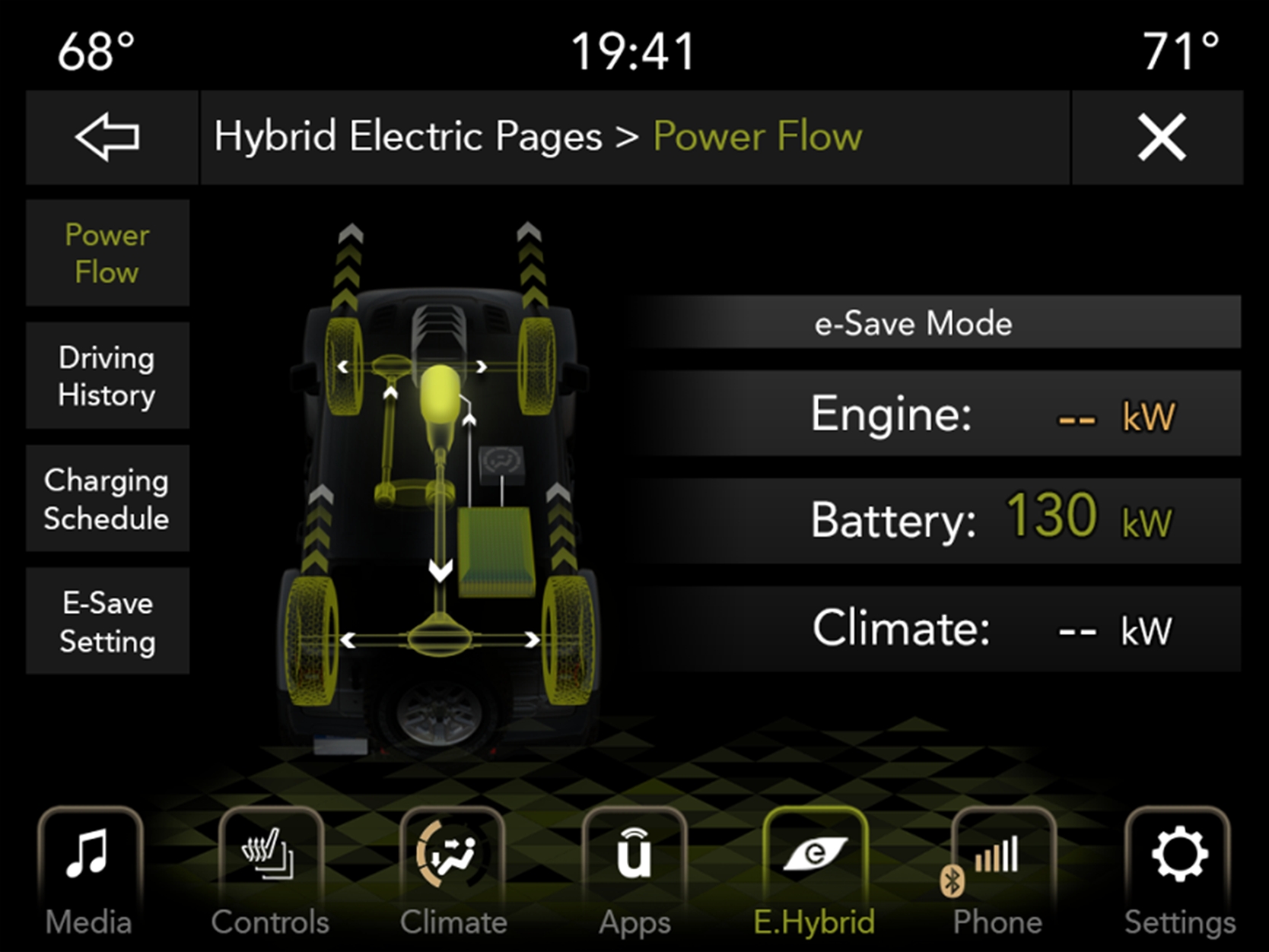 - eSave: Prioritizes propulsion from the 2.0-litre engine, saving the battery charge for later use such as EV off-roading or urban areas were internal combustion propulsion is restricted. The driver can also choose between Battery Save and Battery Charge during eSave via the Hybrid Electric Pages in the Uconnect monitor