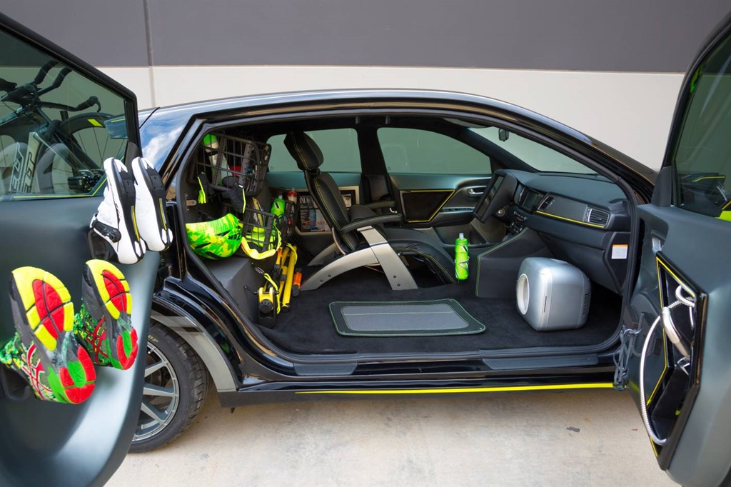 Removal of the passenger-side B-pillar facilitates easy entry into a cabin designed for comfort and efficiency. The back door has been modified to open on a rear-pivot hinge while the front door has been redesigned to open wider than a stock Niro, allowing the doors to open a full 90 degrees. With no reason to drive, the athlete is cosseted in an ultra-comfortable Human Touch zero gravity ergonomic reclining chair. Numerous custom cabinets hold essential supplies, attire and parts, and a portable shower allows for a quick post-race clean-up.