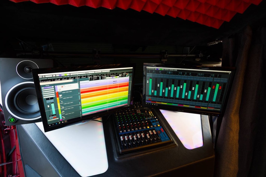 Significant enhancements to the Sedona include the removal of the driver-side B-pillar, steering assembly and gear selector. This makes room for a digital mixing board and dual flat-screen monitors to record tracks. Front-mounted near-field speakers pump out the tunes and when a track is being laid down, the RECORDING light mounted to the roof illuminates. Vocalists will appreciate the boom mic that hangs from the ceiling. Sound-studio-quality acoustic foam panels line the interior to reduce exterior noise during an intense recording session. Should the band decide to host an impromptu roadside show, the Sedona’s lift gate flips open to reveal an imposing stack of amps. There is also storage on the roof for guitars, bass guitars and a myriad other instruments. Fun and comfortable custom bean bags allow the band members to relax or jam in style.