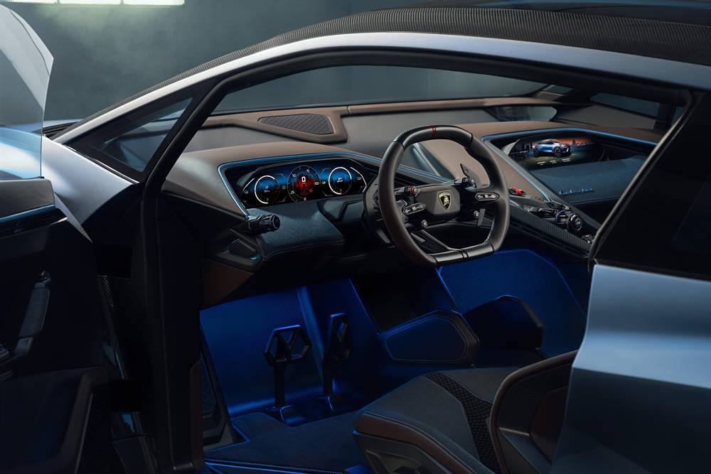 Lamborghini Lanzador concept has a cabin fashioned almost entirely of sustainable materials, all made in Italy. Sustainable high-end Merino wool (from a B Certified Italian company) is used on the dashboard, seats and door panels. Colored thread is made of recycled material regenerated nylon / recycled plastic and many non-visible plastics, such as the foam of the sports seats, are made of 3D-printed recycled fibers. Even the extensively integrated carbon, such as in the center console and door panels, is made of regenerated carbon: a new, two-layer composite material.