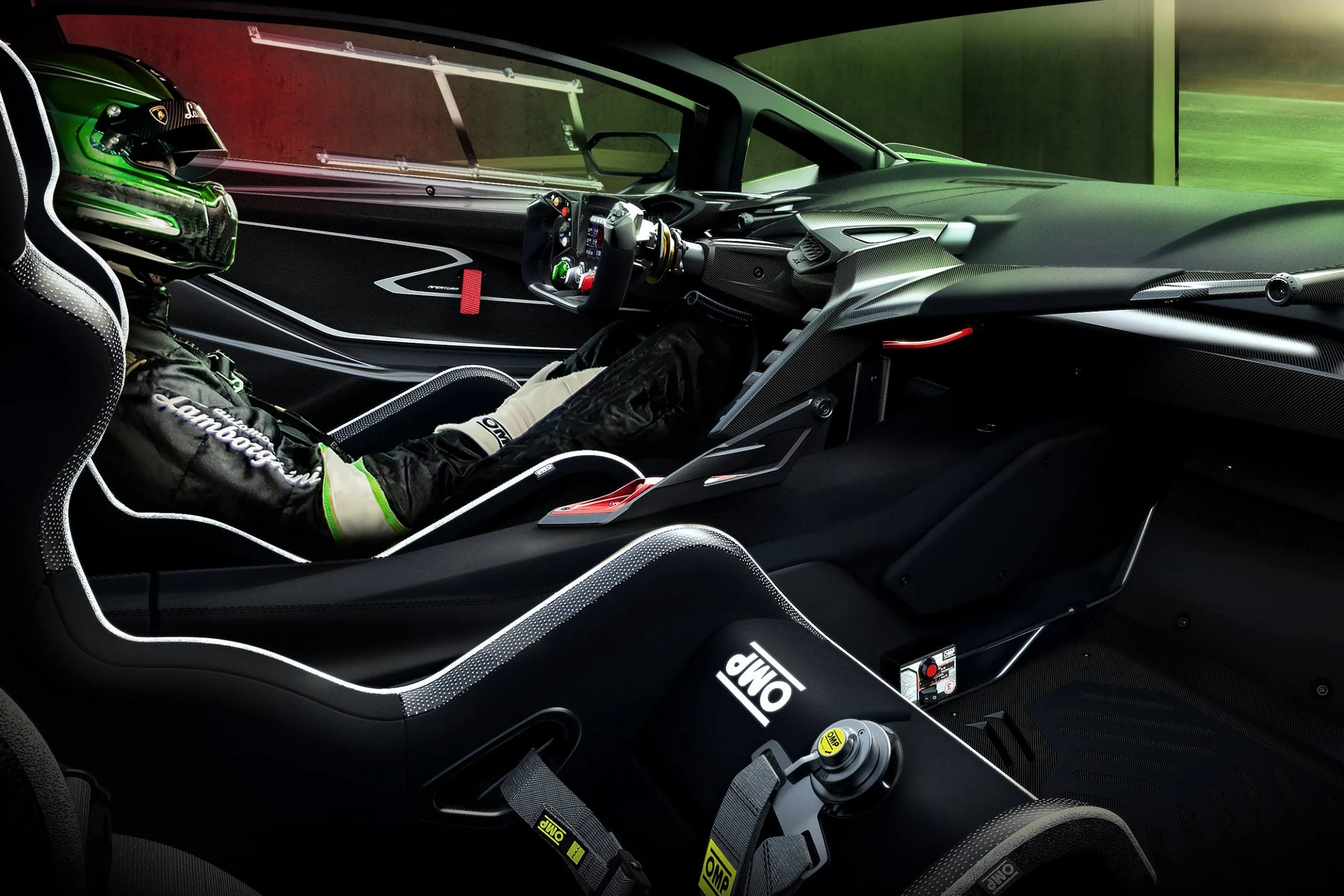 The sleek yet taut and dynamic lines combine the appeal of 1970s prototypes and elements typical of Lamborghini’s DNA, like the hexagonal geometry that characterizes the front headlights, and the roof airscoop and air vents that frame the steering wheel. There is also the unmistakable “Y”, the stylistic feature repeated on the livery and in the cockpit, where each element represents the best compromise between lightweight, functionality and design. In fact, the instrument panel and dashboard are supported by an asymmetrical carbon “Y”, a load-bearing and stylistic element that frames the cockpit, designed to put the driver at the center of an absolute driving experience.