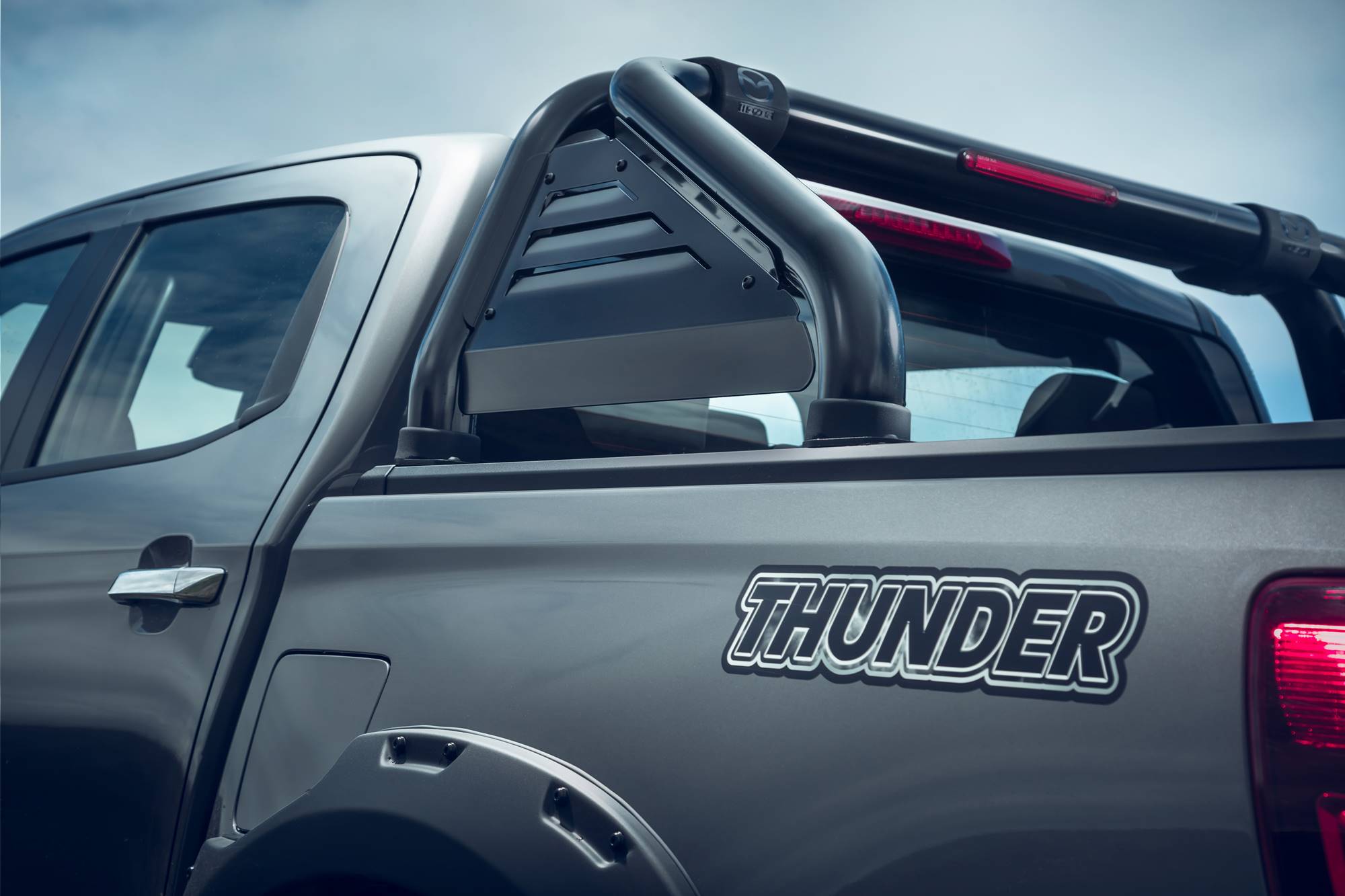 BT-50 Thunder’s side profile, with gorgeous blackened 18-inch alloy wheels, wide fender flares and side steps. Around the back, a premium sports bar and an advanced electric roller tonneau, which securely covers a tub liner for additional tray protection.