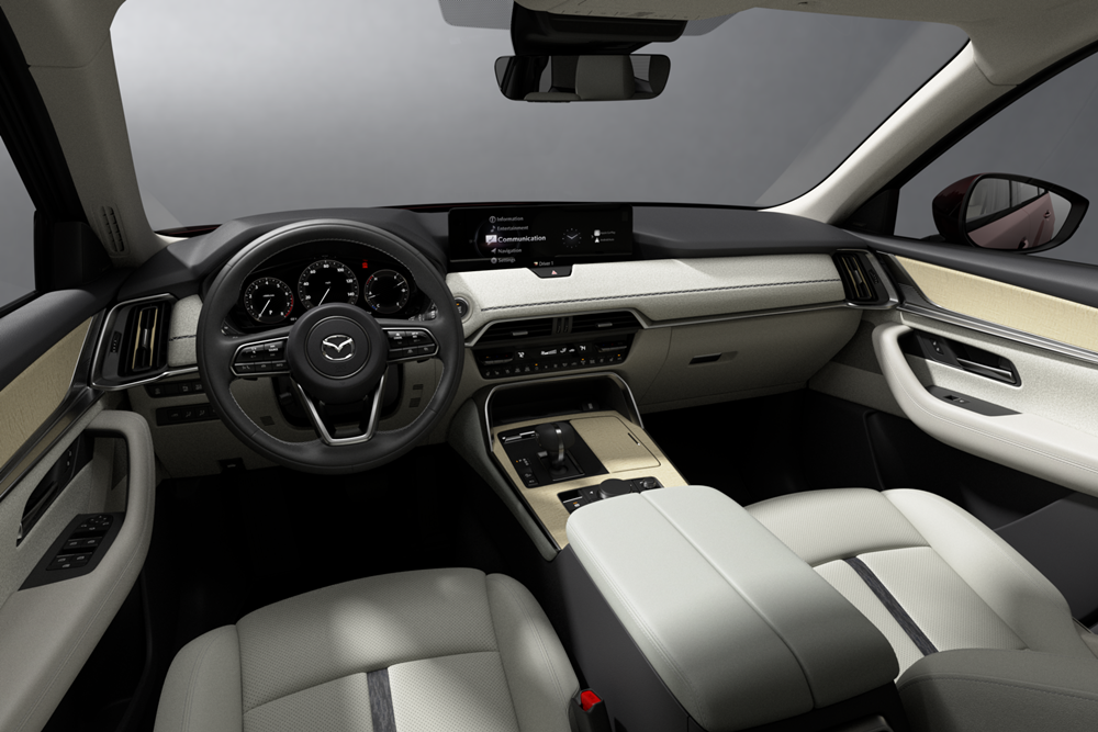 Mazda CX-90’s cabin is created to leave an impression of space and luxury. High end materials include Nappa leather, Maple wood, and tone-on-tone premium fabrics.