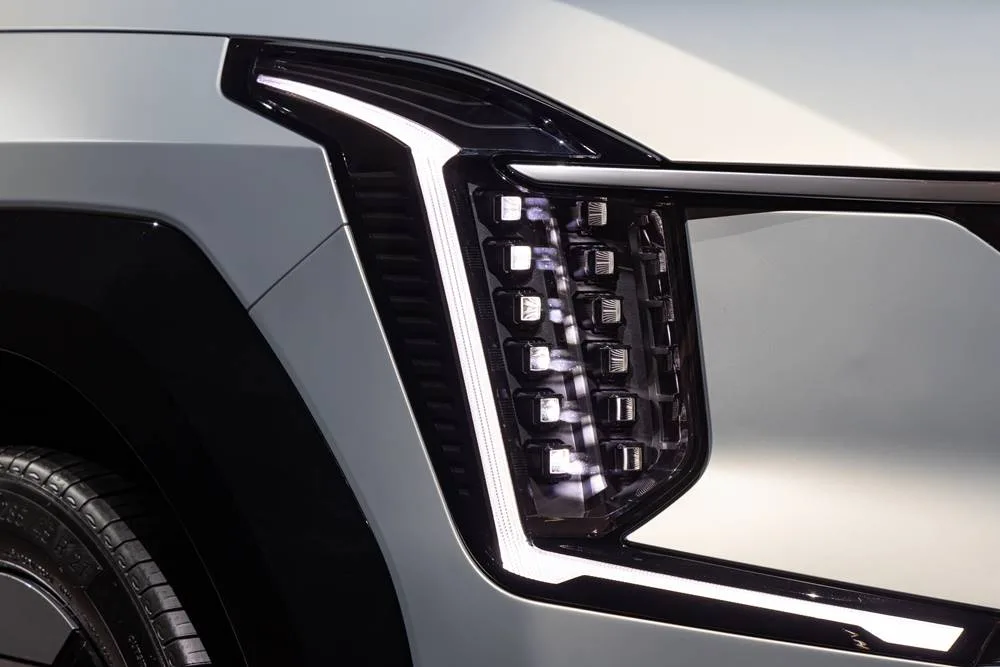 EV9 front end has Cadillac-esque headlights with a 24th century star trek vibe. The ‘Digital Pattern Lighting Grille’ embaces its vertical headlamps. EV9 carries the brand’s signature Tiger Face, but in digital form is barely recognisable. There are two be-cubed LED clusters along each headlamp. KIA claims the DTRLs have a “Star Map” design, but that is somewhat lost on me, so I’ll enjoy it for what it is.