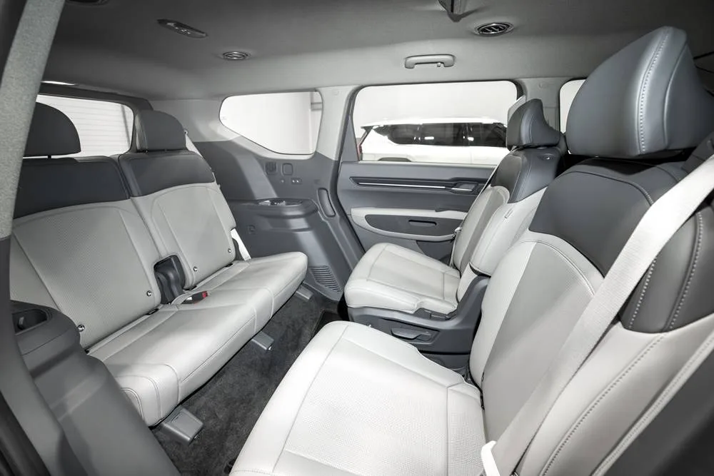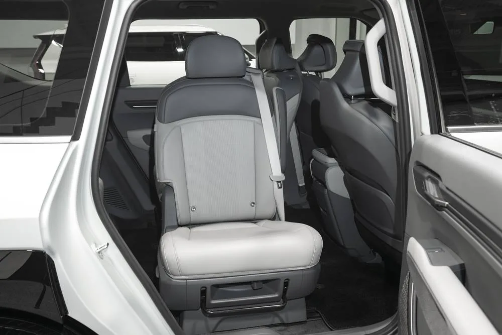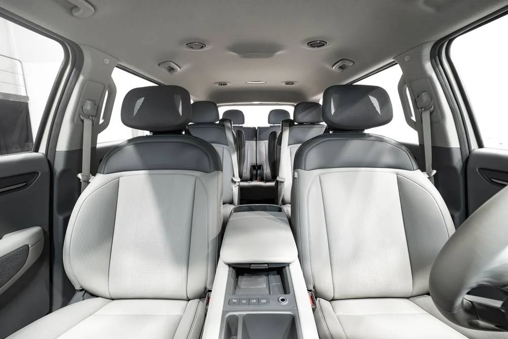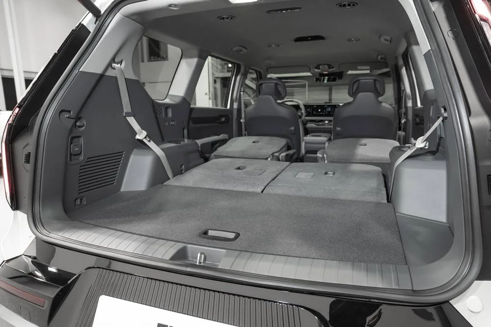 Flush door handles are as seen in EV6, with the massive flat roof floating above a waist that kinks up at the back, something that has become a KIA trademark. The 3-row interior has been wrapped by architecture rather than car design.